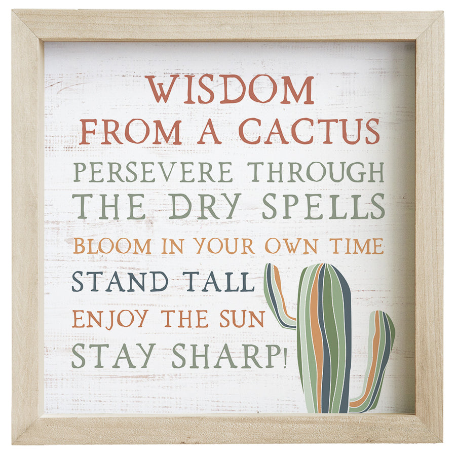 Text found in image: WISDOM FROM A CACTUS PERSEVERE THROUGH THE DRY SPELLS BLOOM IN YOUR OWN TIME STAND TALL ENJOY THE SUN STAY SHARP!