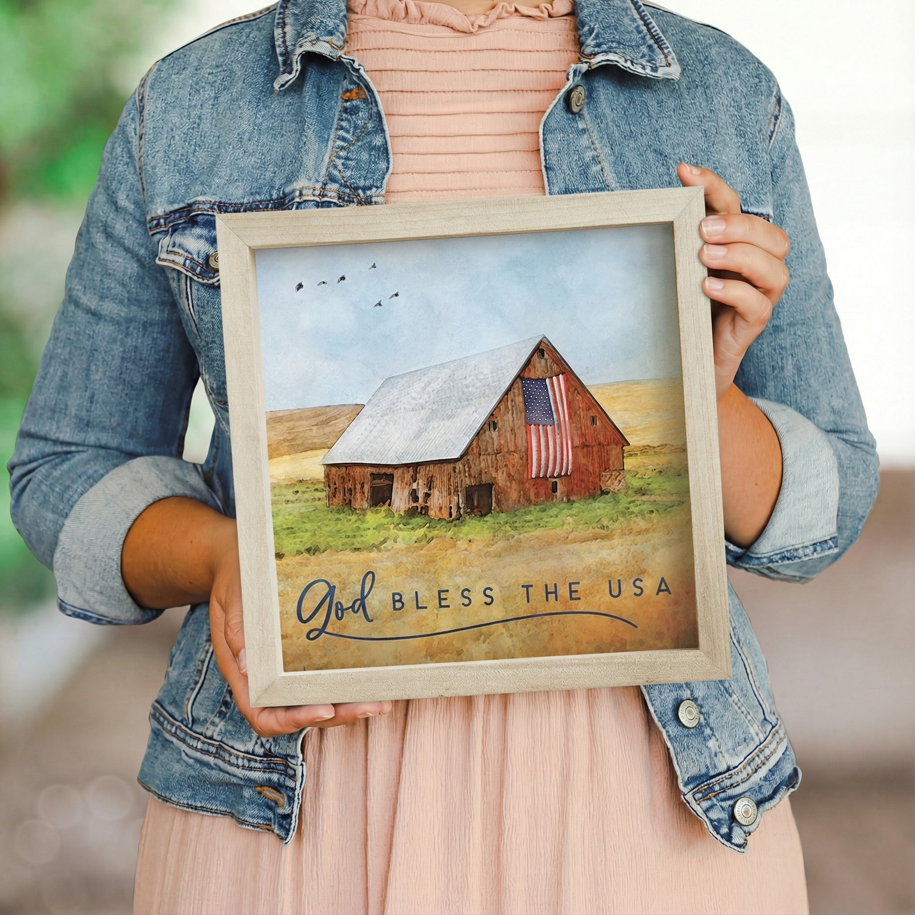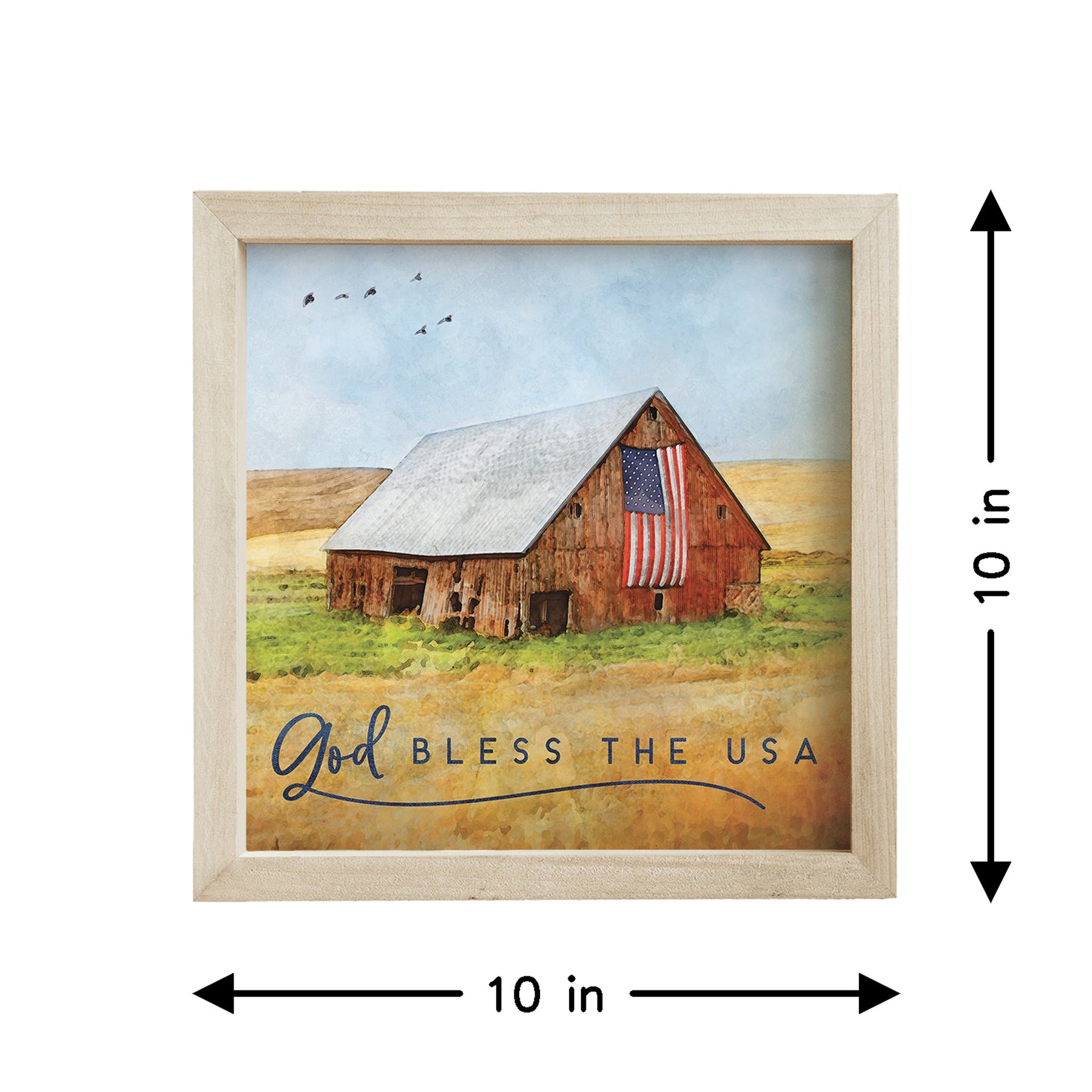 | This patriotic wall art celebrates American pride with a bold, timeless design that speaks to the heart of the nation. The composition features clean, classic typography rendered in a style that evokes both tradition and strength, set against a warm, neutral backdrop that complements any décor. The color palette—rich earth tones and contrasting lettering—creates visual depth and ensures the piece commands attention whether displayed prominently or as part of a gallery arrangement. The artwork carries a reverent, dignified tone, ideal for those who honor their country and wish to express that sentiment in their home. A meaningful message that shares "God Bless The USA". Made from a pine wood frame with an MDF insert, this piece combines durability with classic rustic charm. Measures 10" x 10" x 1.5", weighs 1.05 lbs, and is proudly designed, printed, and made in the USA. A standout among 250th anniversary gifts, perfect for commemorating America's historic milestone. Display this patriotic piece on a tabletop, shelf, or wall using the deep lip hanger for versatile styling options. It fits beautifully in entryways, living rooms, dens, offices, or any space where American pride and patriotic sentiment are celebrated. The compact 10" x 10" size makes it ideal for creating a focused focal point or grouping with complementary décor. This is a thoughtful gift for Independence Day, Memorial Day, Veterans Day, or year-round patriotic display. It's ideal for those who take pride in their American heritage, military families, veterans, and anyone seeking meaningful artwork that honors the nation. It also makes a wonderful housewarming, office, or personal décor gift for patriotic enthusiasts who appreciate quality, made-in-USA craftsmanship. |
