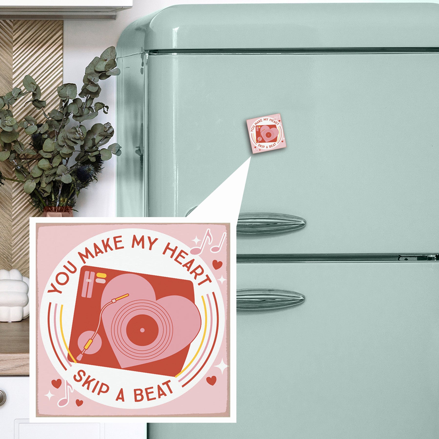 This charming square magnet features a romantic design with elegant typography that captures the sweetness of love at first sight. The soft, neutral wood tone provides a warm backdrop for the message, while the clean, modern lettering creates a perfect balance between sophistication and playfulness. The design invites a smile every time you glance at it—whether displayed on your refrigerator, locker, or any magnetic surface in your home. A simple message that speaks volumes — "You Make My Heart Skip A Beat."