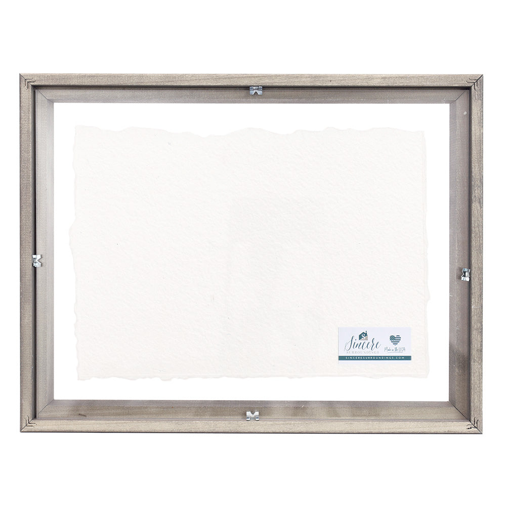 This piece is composed of a solid wood frame that secures the elegant design on paper mâché between two pieces of plexiglass. The depth of the frame also allows for tabletop display or a wall hanging application. 14” x 11” x 1.5”. Product weight – 21 oz. Proudly designed, printed, and made in the USA by Sincere Surroundings.