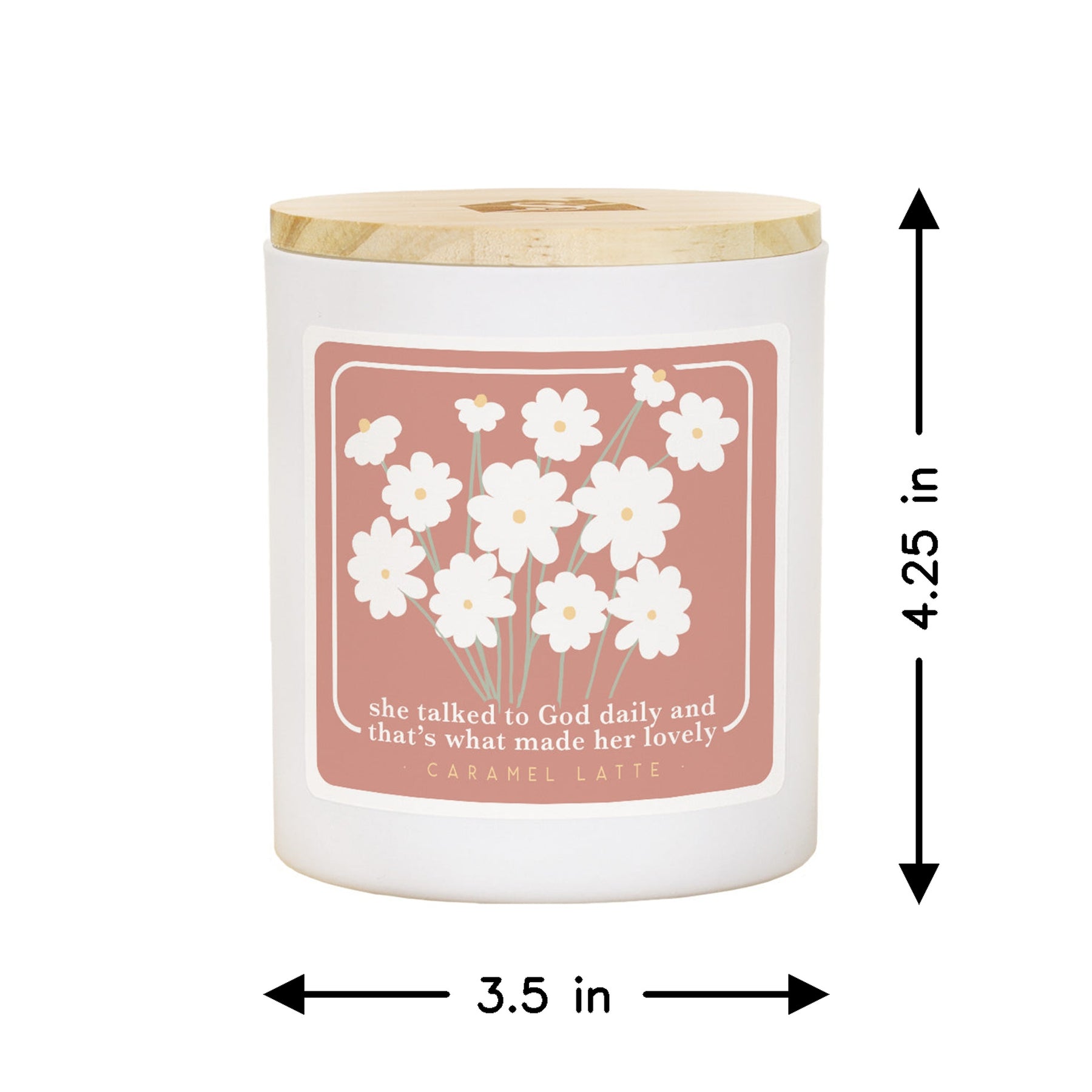 A soft, warm illustration captures a woman in quiet reflection, her face serene and peaceful as she gazes upward with an expression of deep spiritual connection. The artwork employs gentle watercolor washes in warm caramels, soft creams, and subtle earth tones that evoke comfort and inner peace. Delicate line work defines her features with tenderness, while the composition draws the eye upward, mirroring the act of prayer and communion with the divine. The overall palette—rich yet soothing—creates an atmosphere of reverence and stillness, inviting viewers to pause and reflect on their own spiritual practices. The typography is elegantly rendered, complementing the illustration's grace and devotion. This heartfelt reminder shares, "She Talked To God Daily And That's What Made Her Lovely."