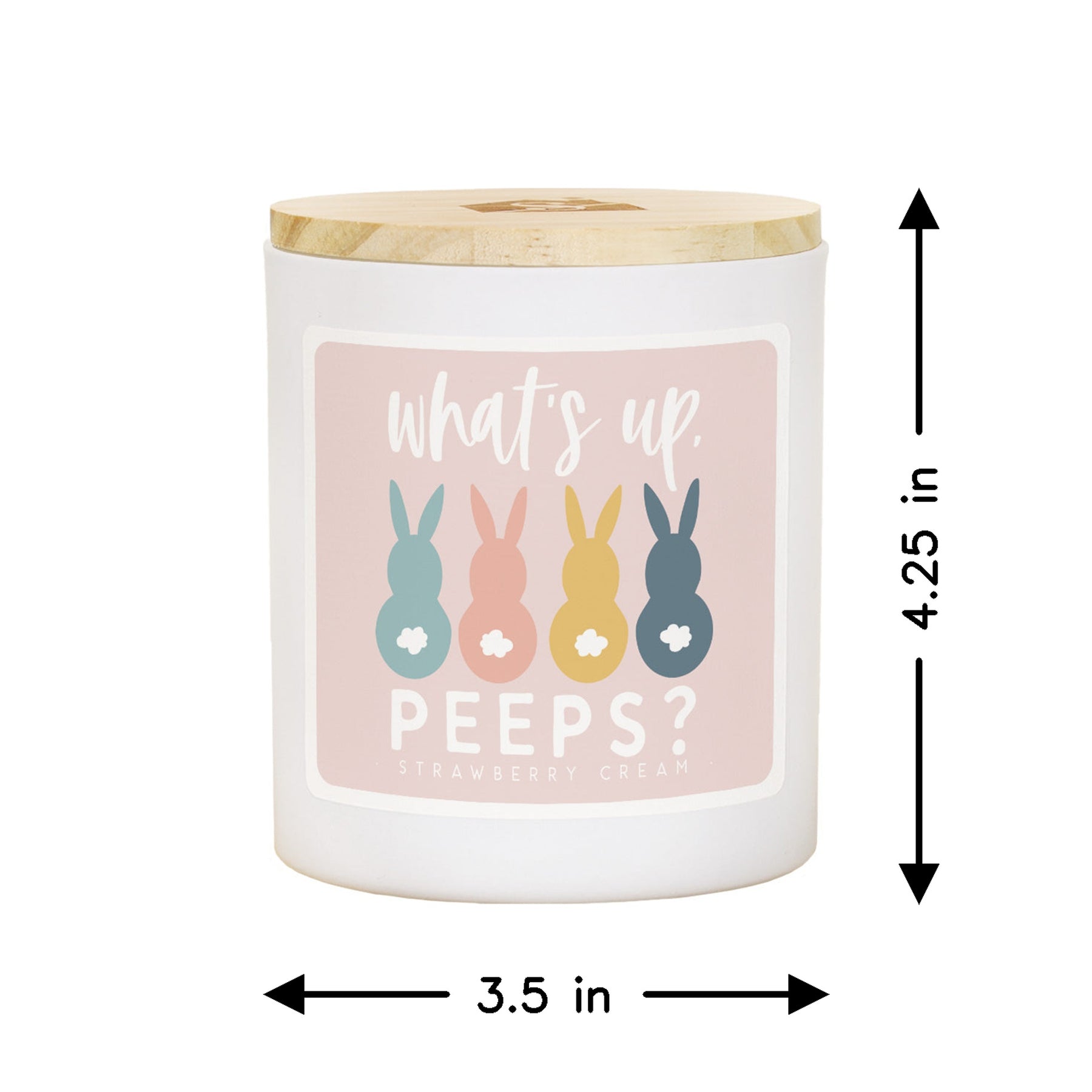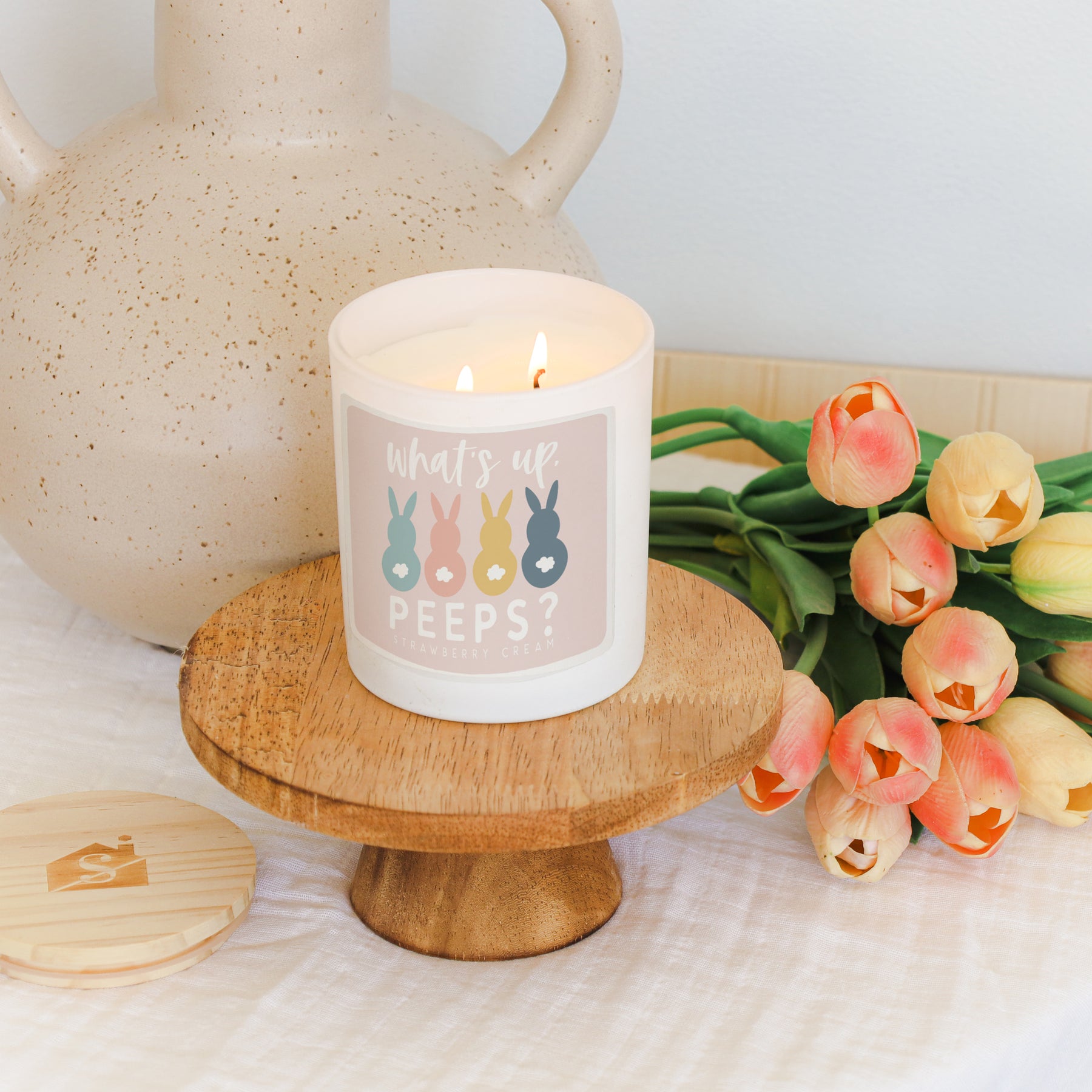 This cheerful Easter candle celebrates spring's playful spirit with a vibrant design that captures the joy of the season. Soft pastel hues blend across the label, creating a warm, inviting atmosphere that feels both festive and whimsical. Bold, friendly typography dominates the composition, paired with charming Easter-themed illustrations that evoke smiles and seasonal cheer. The artwork's lighthearted energy makes it an instant conversation starter, ideal for those who embrace Easter celebrations with humor and heart. A playful message that shares "What's Up, Peeps?."