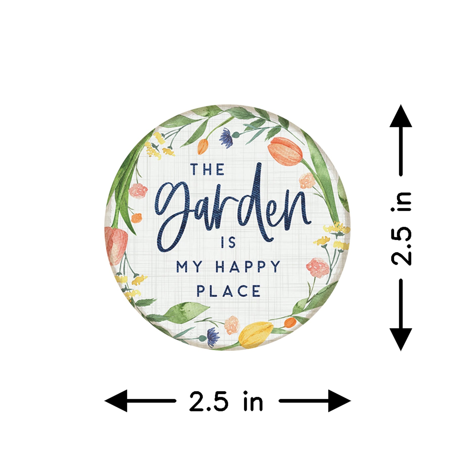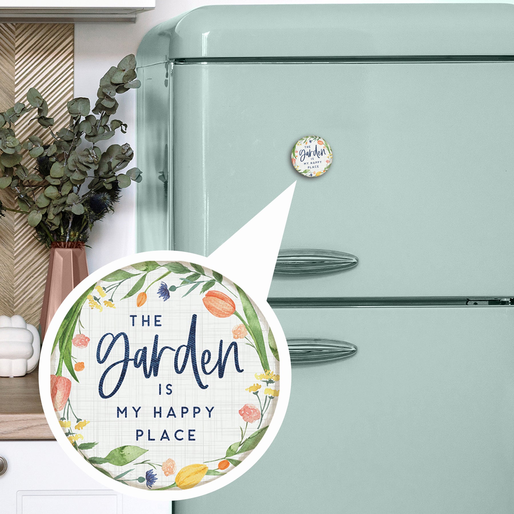 A cheerful celebration of garden life unfolds in this charming round magnet, where warm earth tones and natural wood variations create an inviting, organic aesthetic. The design captures the simple joy of tending plants and spending time outdoors, with an illustration style that feels both whimsical and grounded. Soft greens, warm neutrals, and gentle botanical elements combine to evoke the peaceful sanctuary that a garden becomes for those who love it. The composition draws the eye inward, creating an intimate sense of calm and connection to nature. Clean, readable typography is thoughtfully placed to enhance rather than overwhelm the artwork, allowing the visual warmth to shine. A meaningful message that shares "The Garden Is My Happy Place."