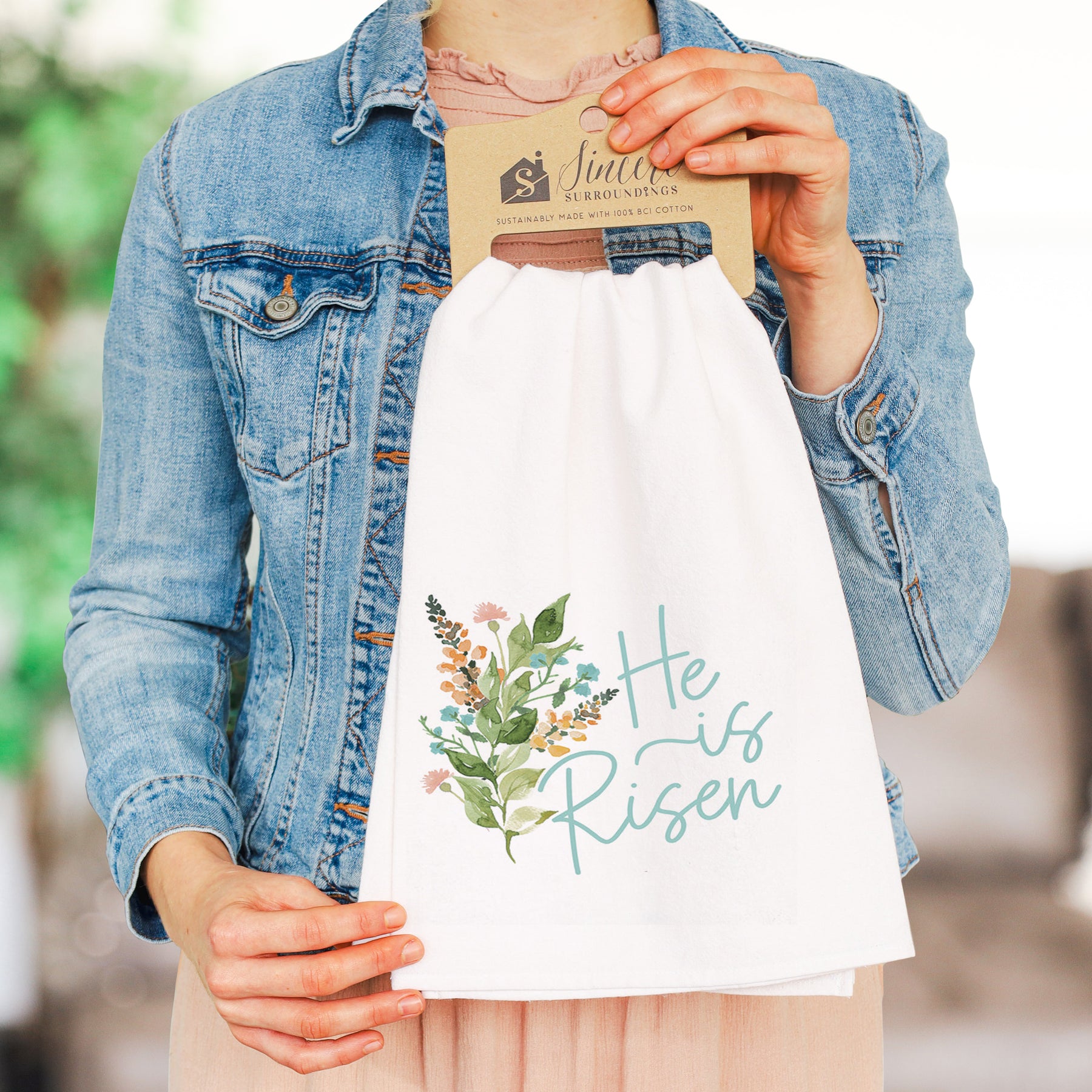 This Easter tea towel celebrates the season's most sacred message with elegant botanical artistry. Soft watercolor florals in spring pastels—blush pink, cream, and sage green—bloom across the natural cotton ground, creating a serene, garden-inspired composition. The flowers are rendered with delicate brushwork that feels both modern and timeless, their gentle hues evoking renewal and hope. Crisp, refined typography anchors the design, allowing the floral arrangement to speak to the heart of the season. The overall aesthetic is sophisticated yet warm, inviting quiet reflection and spiritual joy into any kitchen or dining space. A meaningful message that shares "He Is Risen".