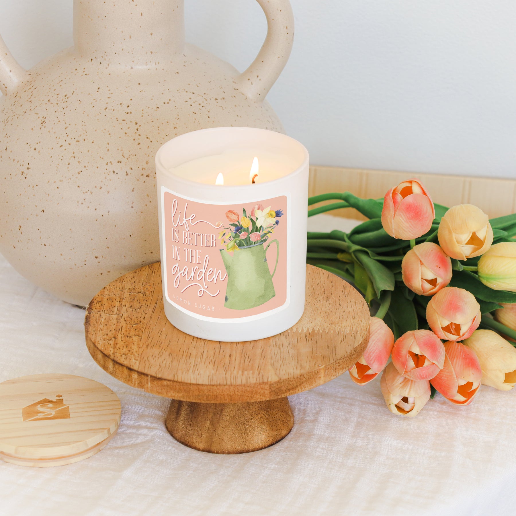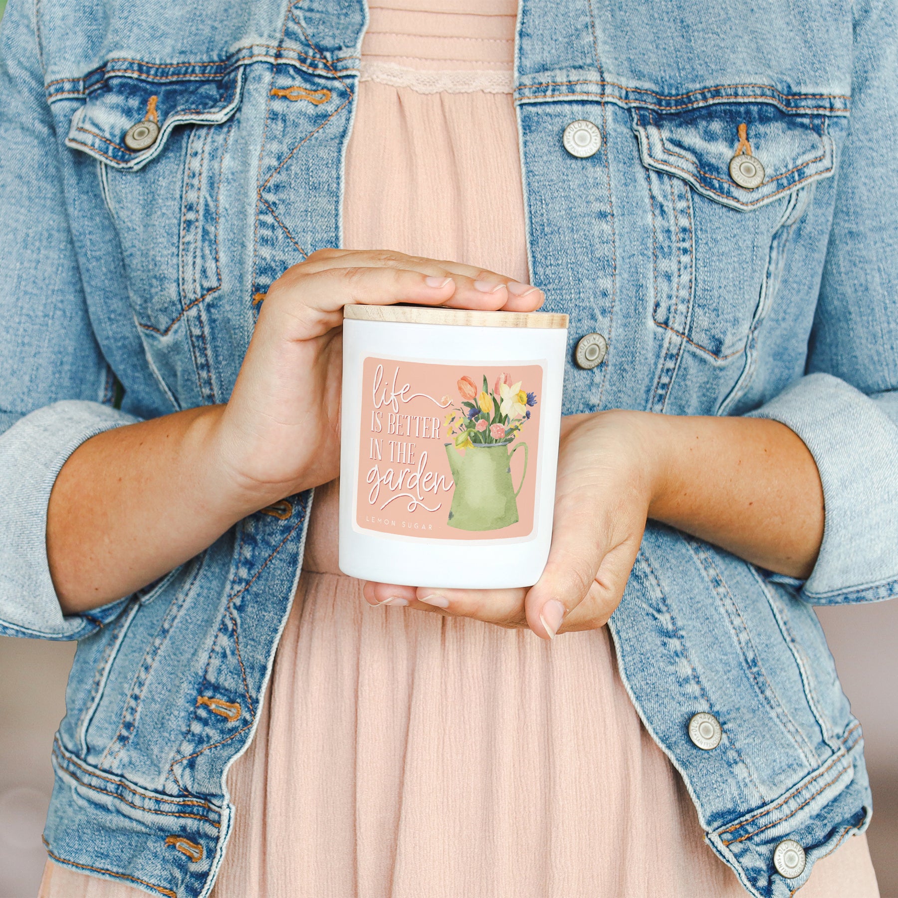 A cheerful candle that celebrates the joy of Spring with its bright, sun-filled aesthetic and whimsical floral illustration. The design features warm golden tones and soft botanical elements that evoke the feeling of a perfect, flower-filled day—capturing that delightful moment when sunshine and blooms come together. The color palette radiates optimism, with sunny yellows and fresh greens creating an inviting, uplifting mood that instantly brightens any room. The typography is playful and modern, positioned prominently across the candle's label, bringing a smile and a sense of lighthearted charm. This is the kind of piece that speaks to anyone who loves Spring's renewal, garden moments, and simple pleasures. This heartfelt reminder shares "Life Is Better In The Garden."