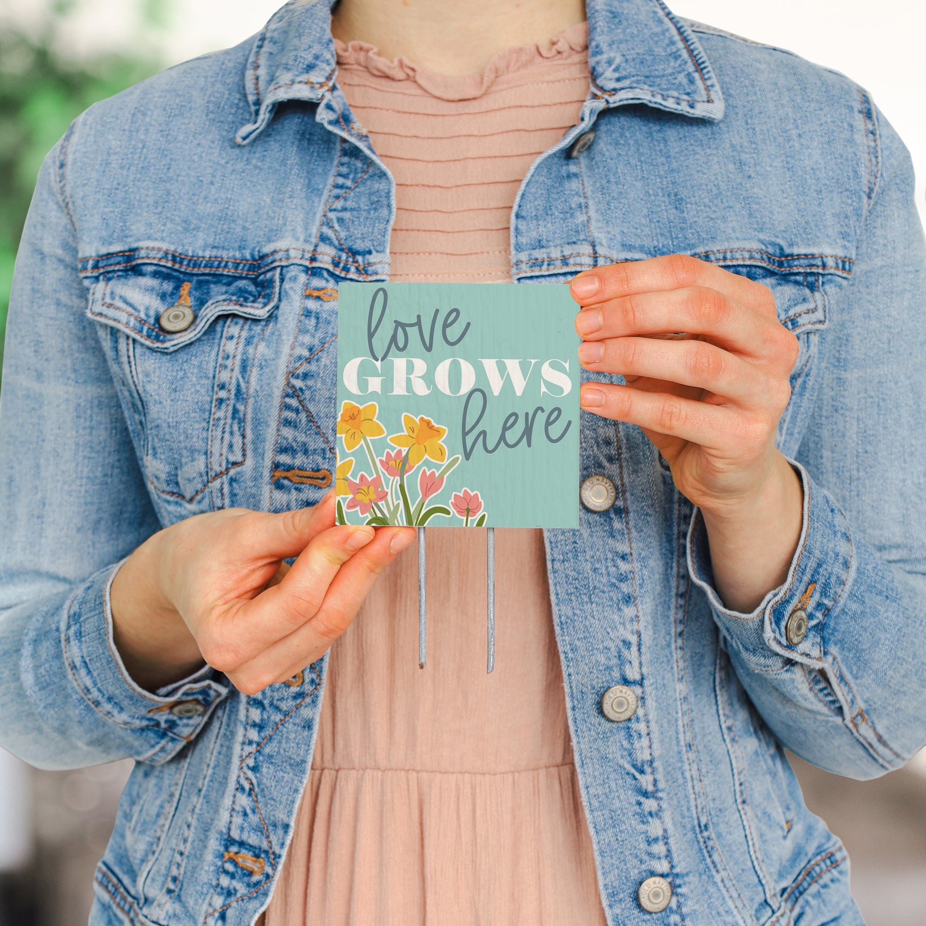Celebrate the beauty of growth and connection with this charming plant stake, adorned with a warm, encouraging design in soft spring tones. The artwork features graceful typography that speaks to the heart, with 'Love Grows Here' rendered in a style that feels both organic and intentional. The color palette—gentle greens, warm neutrals, and touches of floral inspiration—perfectly captures the essence of renewal and nurturing. This meaningful message invites reflection on how love flourishes in the spaces we cultivate, making it a visual reminder of care and connection.