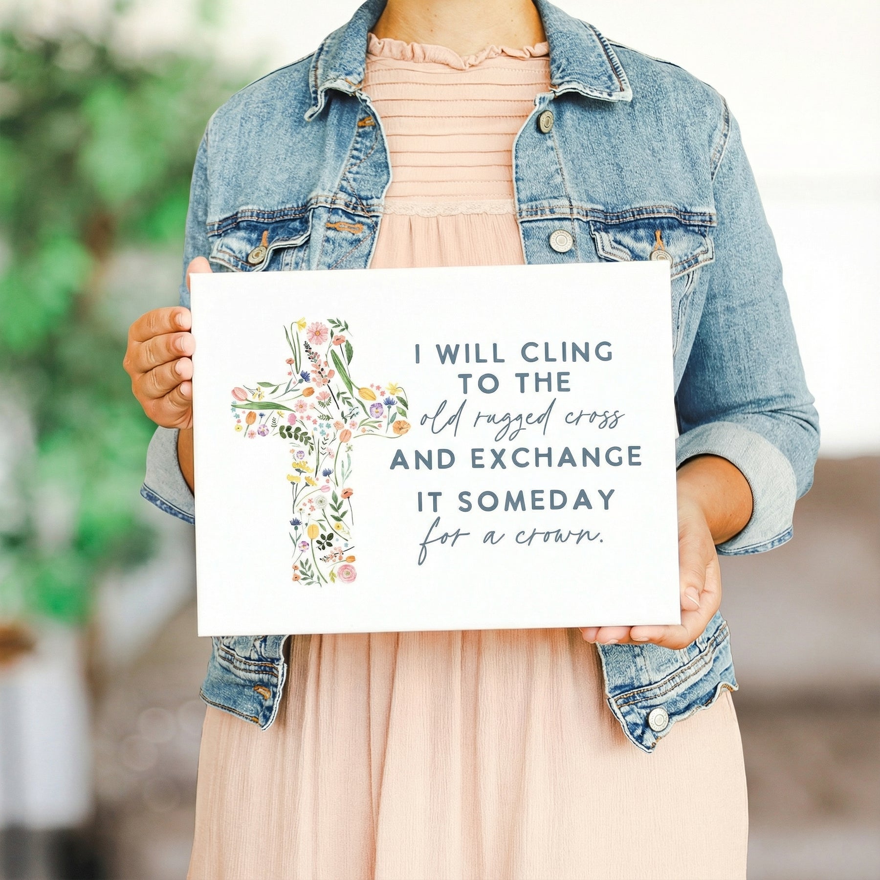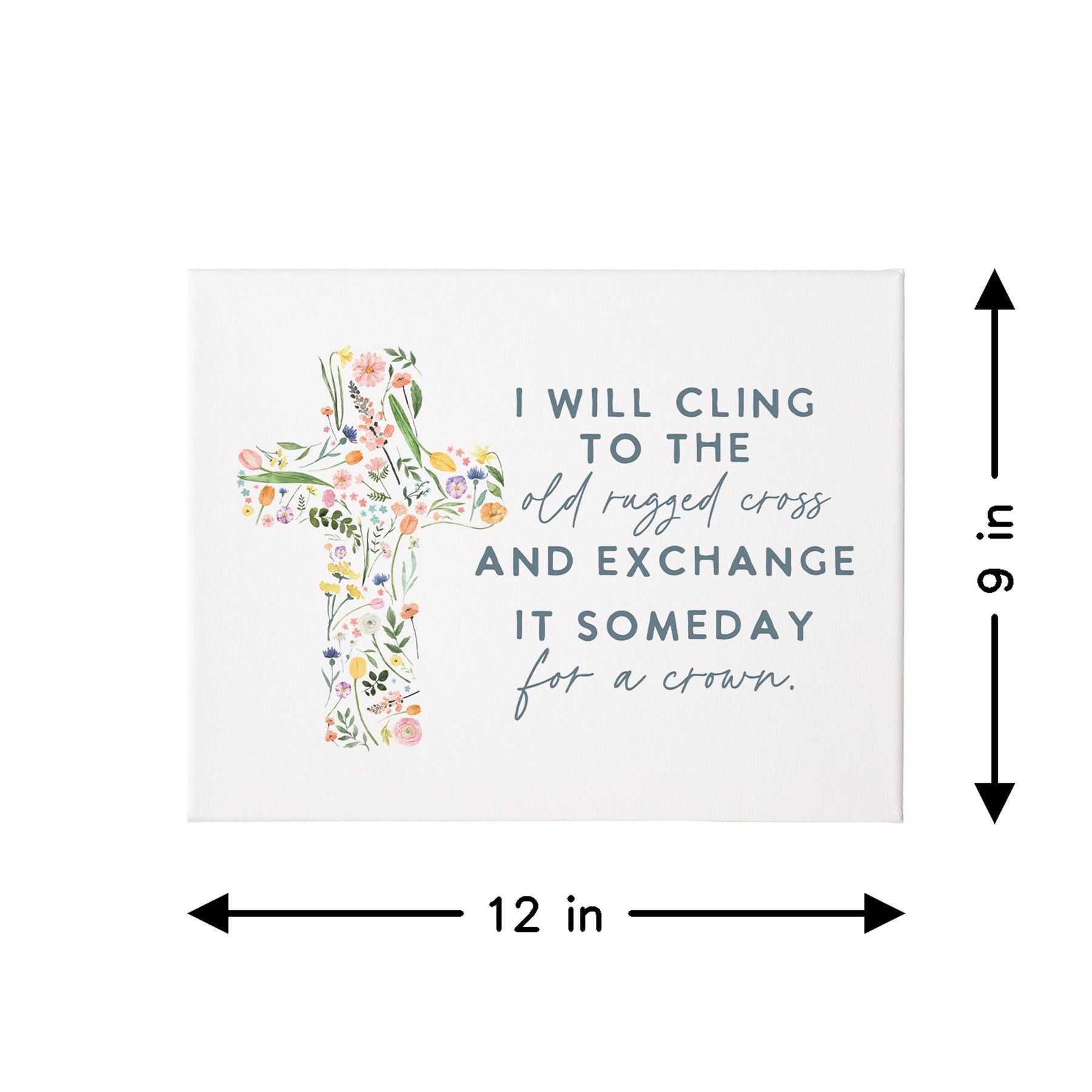This wrapped canvas features a serene illustration of the iconic Old Rugged Cross rendered in soft, muted earth tones that evoke reverence and spiritual contemplation. The composition centers the cross with gentle, understated brushwork that conveys both strength and grace, while the warm palette of beiges, browns, and touches of gold creates an atmosphere of timeless faith and hope. The typography is displayed in an elegant, hand-lettered style that complements the sacred imagery without overwhelming it. The overall design invites quiet reflection and serves as a powerful visual reminder of Christian faith and redemption. A meaningful message that speaks volumes—"I Will Cling To The Old Rugged Cross And Exchange It Someday For A Crown."