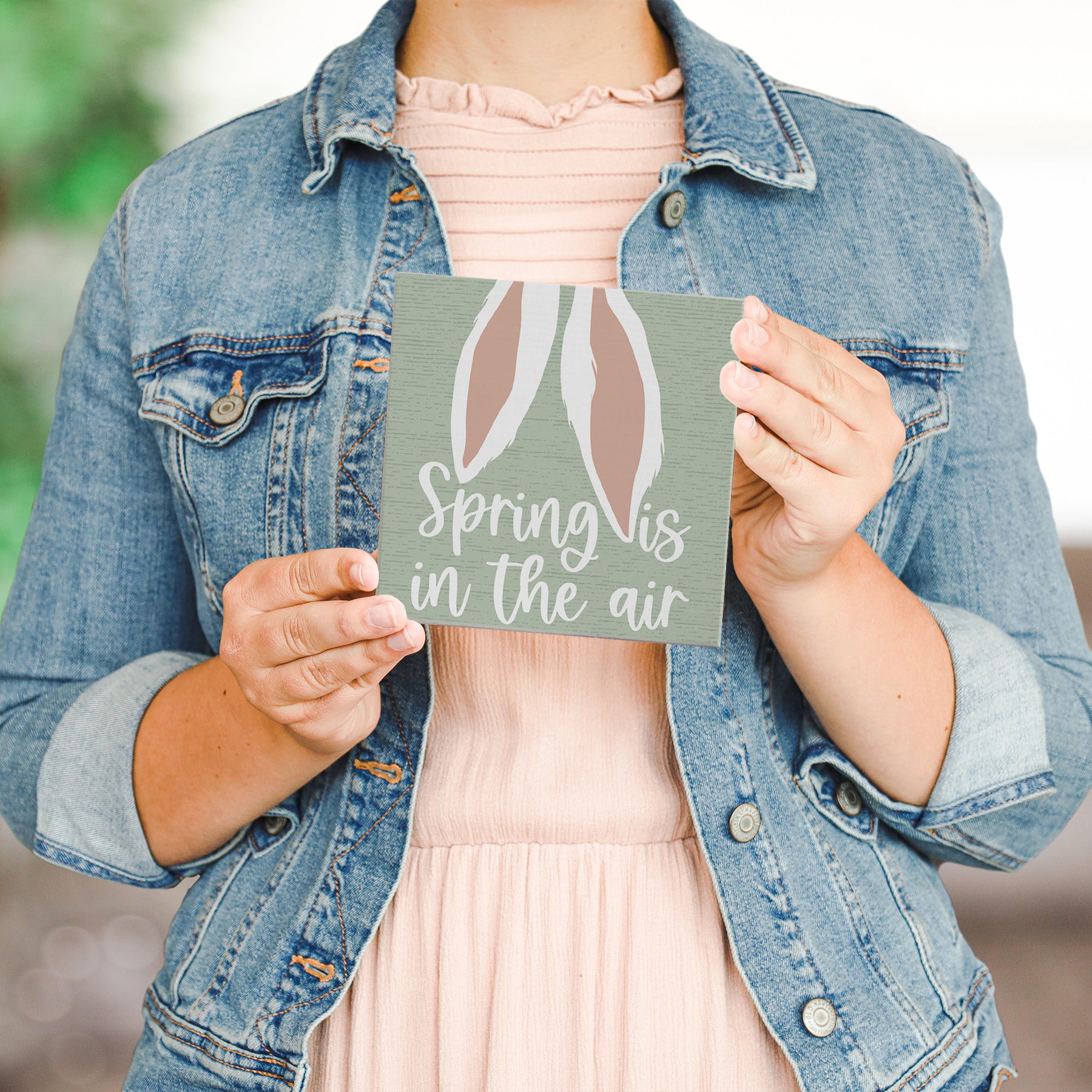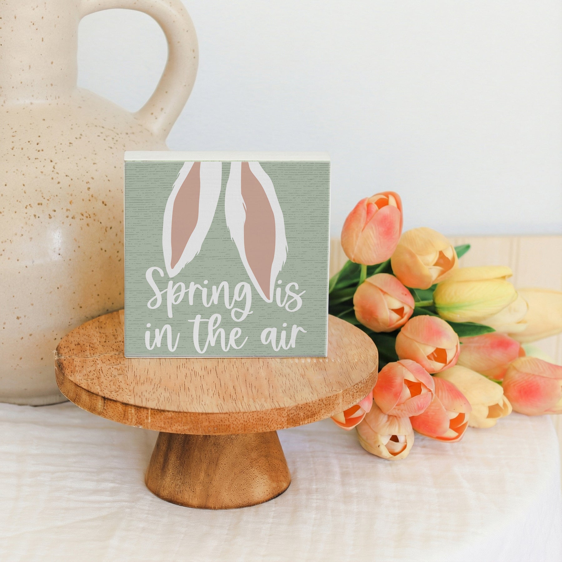 Celebrate the season with this charming spring-themed shelf sitter, where playful bunny ears emerge from a soft, pastel color palette that captures the renewal and joy of Easter. The design features hand-lettered typography paired with whimsical illustration, creating a lighthearted composition that invites smiles and springtime cheer. Soft greens, pinks, and whites blend harmoniously across the wooden surface, while the friendly, approachable style speaks to the simple pleasures of the season. The overall aesthetic is warm and inviting—ideal for those who celebrate Easter or simply embrace the beauty of spring. A playful message that shares "Spring Is In The Air."