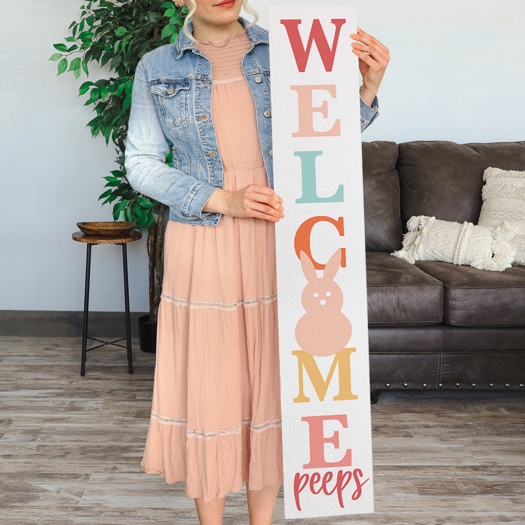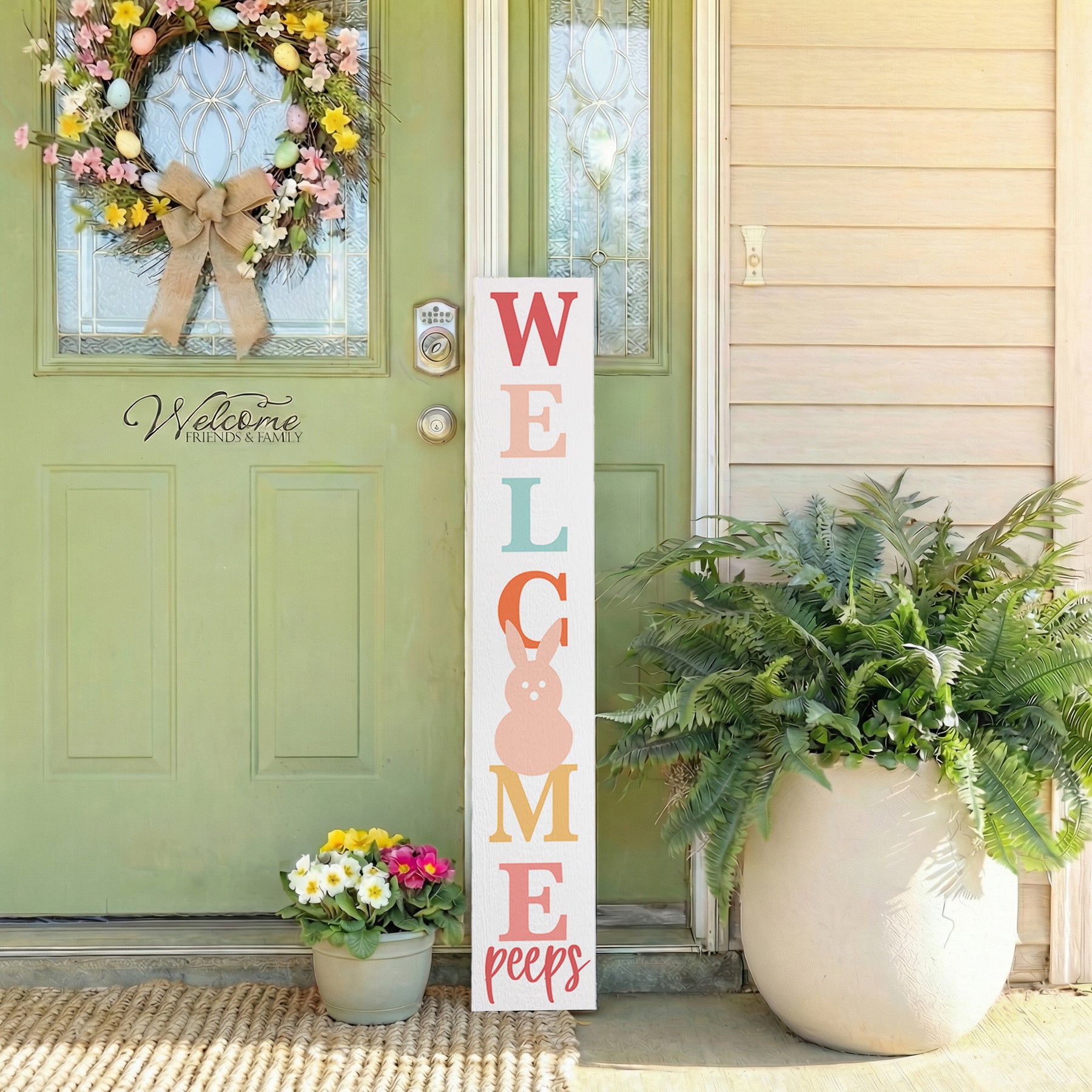 A cheerful Easter welcome awaits with this delightful porch board, where soft pastel hues and playful typography create an inviting spring greeting. The design features charming peep illustrations rendered in gentle watercolor tones—soft yellows, pinks, and blues—that evoke the joy and renewal of the Easter season. The lettering is bold and friendly, perfectly balanced with the whimsical imagery to create a warm, celebratory mood that immediately draws visitors in. The overall composition radiates springtime cheer and hospitality, making it an ideal way to greet guests during Easter celebrations and beyond. A playful message that shares "Welcome Peeps".