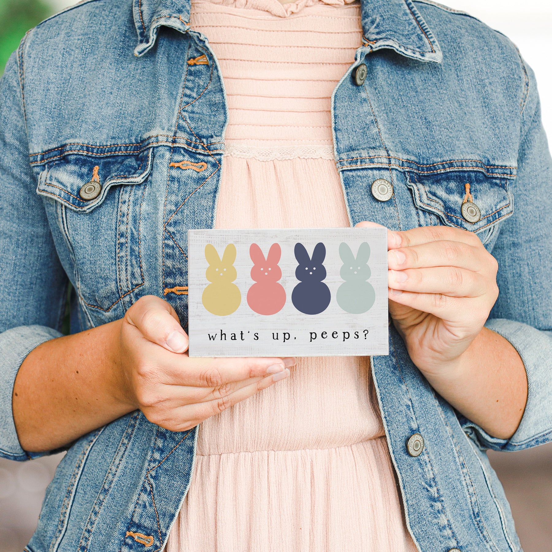 A cheerful Easter and spring celebration springs to life in this playful wooden sign, where vibrant pastel hues and whimsical illustrations create an instant mood of joy and lightheartedness. The design features adorable, expressive chick characters rendered in soft watercolor tones—yellows, pinks, and mint greens—that dance across the surface with personality and charm. Hand-lettered typography in a friendly, casual script sits prominently at the center, capturing the spirit of springtime fun and Easter festivities. The overall composition balances sweet illustration with bold lettering, creating a piece that radiates warmth and playful energy. A playful message that shares "What's Up, Peeps?"
