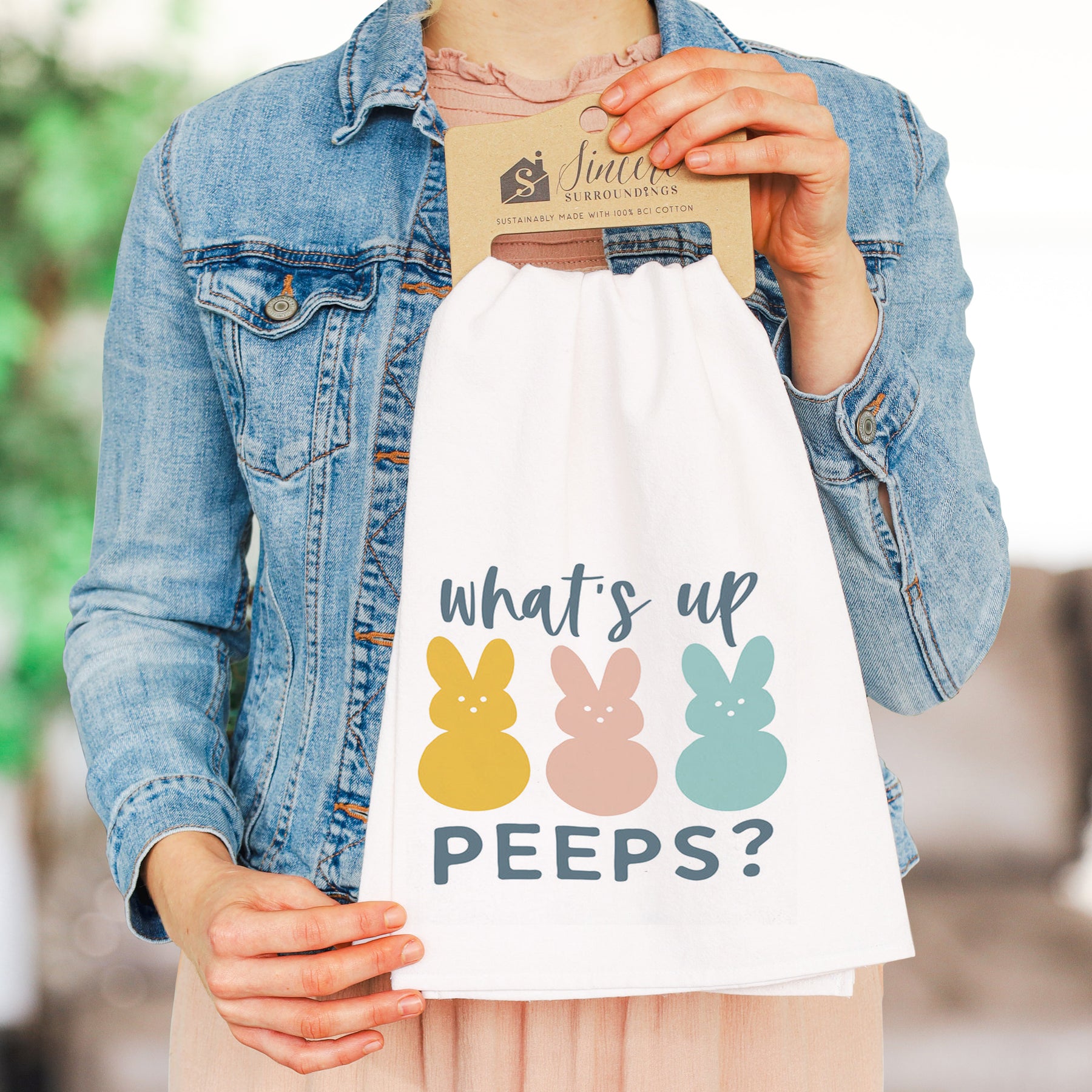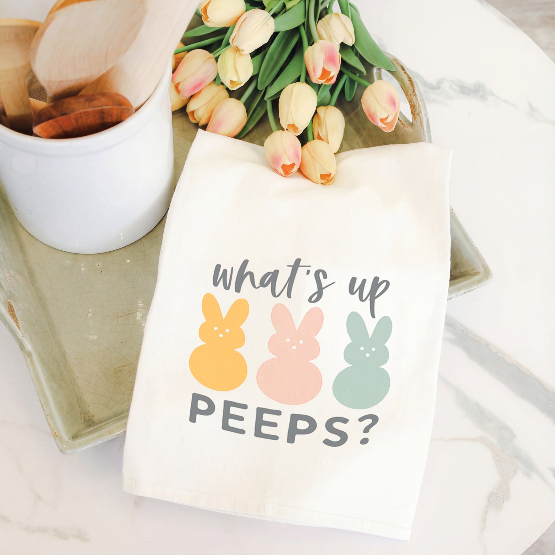 A cheerful Easter and spring design bursts with playful energy, featuring adorable illustrated chicks and pastel hues that celebrate the season's joy and renewal. The composition balances whimsical character work with clean typography, creating a lighthearted mood that invites smiles every time you reach for this kitchen essential. Soft yellows, pinks, and greens dance across the fabric, evoking springtime warmth and the playful spirit of Easter celebrations. The design captures that perfect moment of seasonal fun—fresh, modern, and impossible to resist. A playful message that shares "What's Up Peeps?"