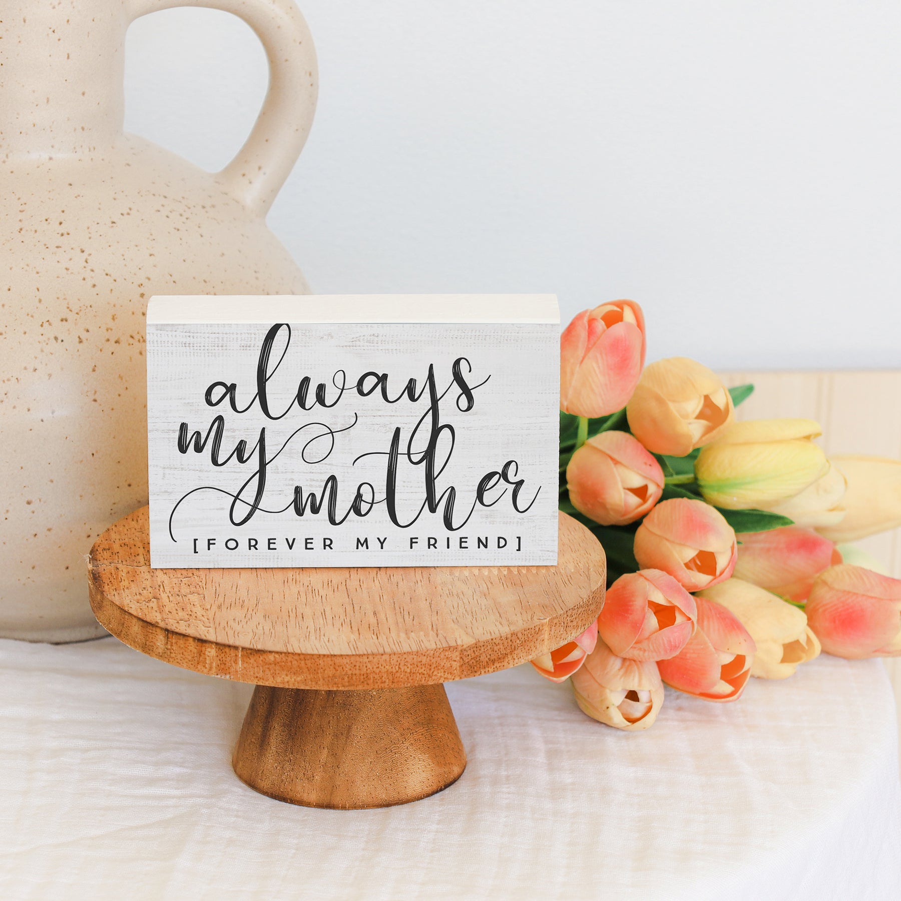 This charming shelf sitter is designed to sit prominently on a bookshelf, nightstand, dresser, or entryway table—anywhere a daily reminder of maternal love and friendship feels right. Its compact size makes it perfect for creating a gallery of meaningful moments throughout the home, whether displayed alone or paired with other heartfelt pieces.