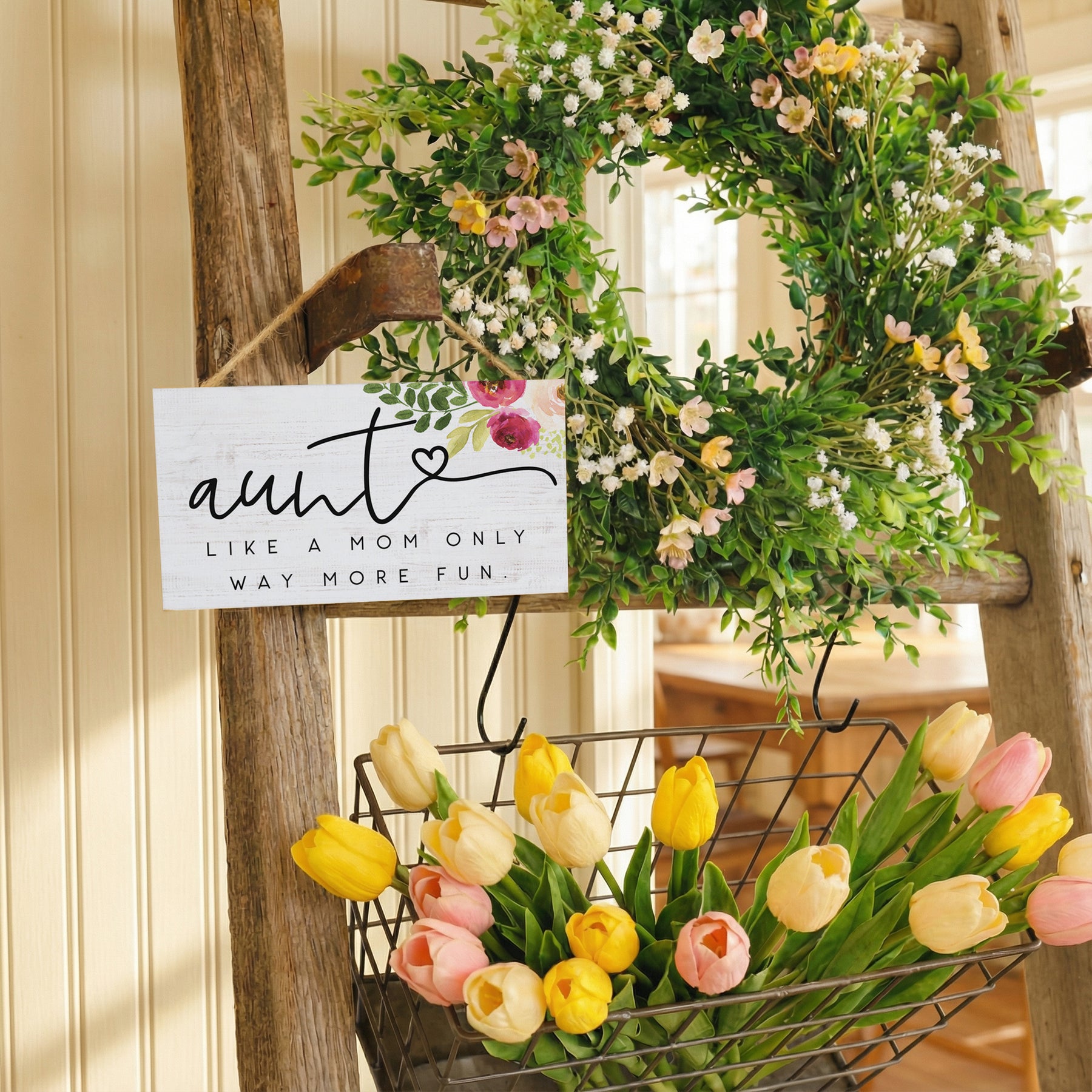 This charming wooden accent celebrates the special bond between nieces and their beloved aunts with warmth and humor. The design features hand-lettered typography in a friendly, approachable style set against natural raw wood, creating an inviting contrast that draws the eye. Soft, neutral tones let the message take center stage, while the rustic aesthetic speaks to authenticity and heartfelt sentiment. The composition balances playfulness with genuine affection, making it feel both lighthearted and deeply meaningful. A playful message that shares "Aunt Like A Mom Only Way More Fun."