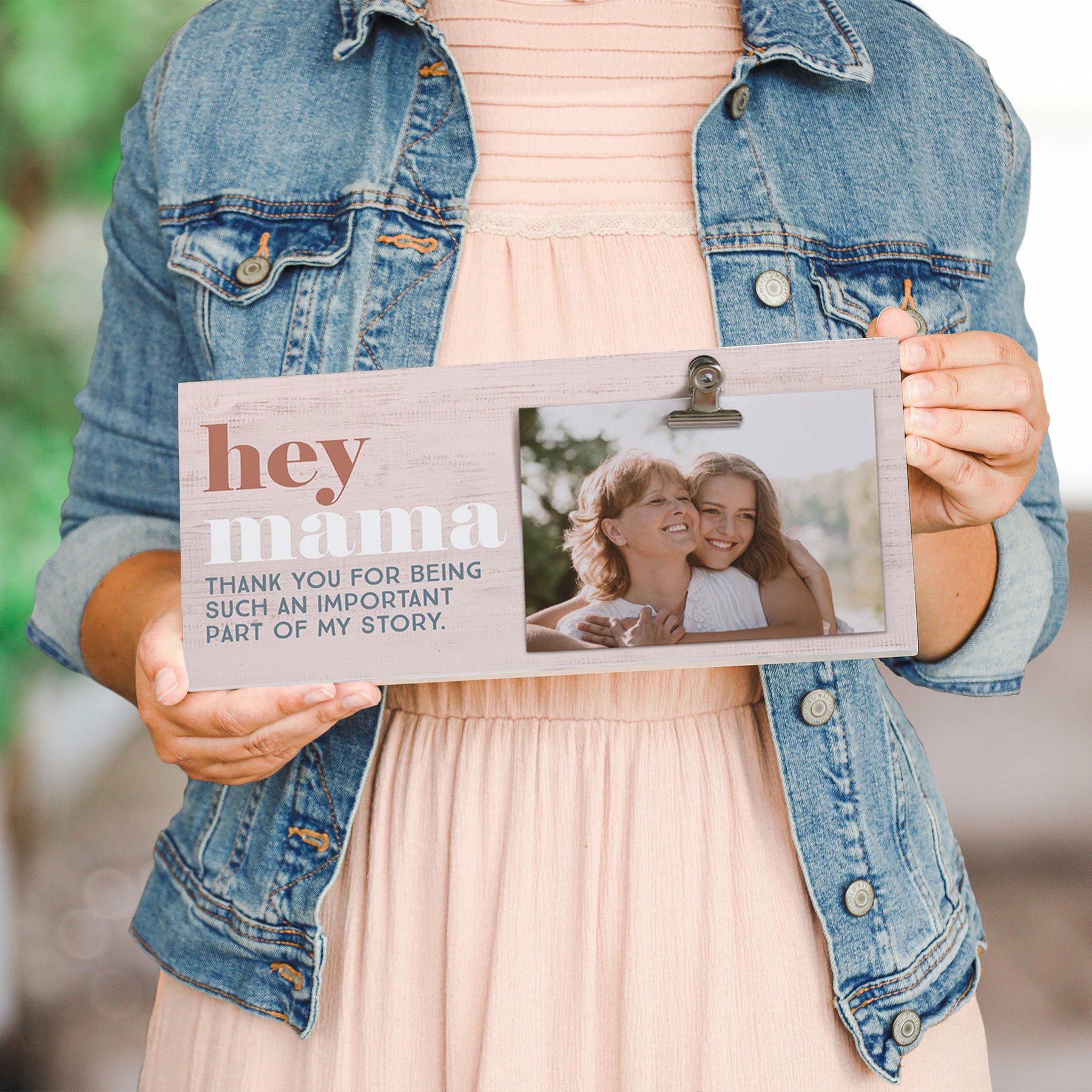 This charming picture clip celebrates the women who shape our stories with warm, heartfelt typography that speaks directly to the heart. The design features elegant lettering in a clean, readable style against a soft, neutral background that allows the message to shine. The composition is thoughtfully balanced, with the text arranged in a way that draws the eye naturally across the piece, creating a moment of reflection and appreciation. The overall aesthetic is modern yet timeless, capturing the essence of gratitude in a way that feels both intimate and universal. The wooden frame, with its natural grain and warm tone, adds organic beauty to the presentation, while the metal clip detail provides a functional, gallery-like touch that elevates the piece beyond a simple decoration. A meaningful message that shares "Hey Mama Thank You For Being Such An Important Part Of My Story."