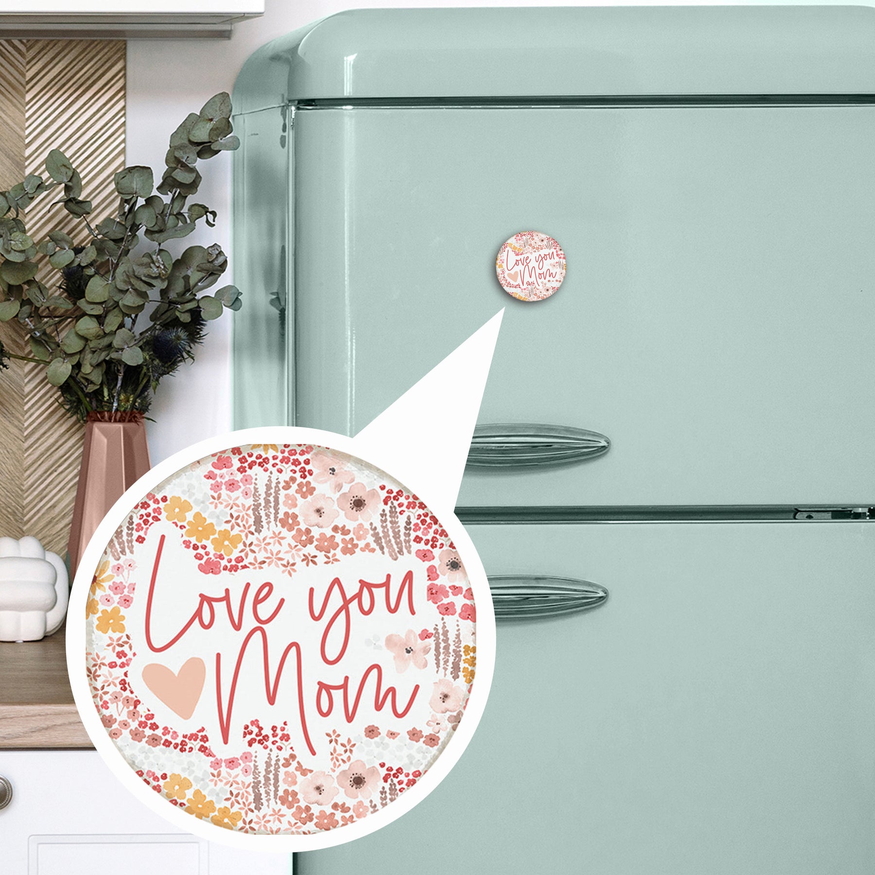 A charming floral magnet celebrates the special bond between a child and mother with warm, botanical-inspired artwork. Soft watercolor florals in blush and sage tones frame the composition, creating an inviting, tender aesthetic that speaks to love and appreciation. The hand-lettered typography is styled in an elegant script, positioned prominently to draw the eye. This heartfelt reminder shares "Love You Mom".