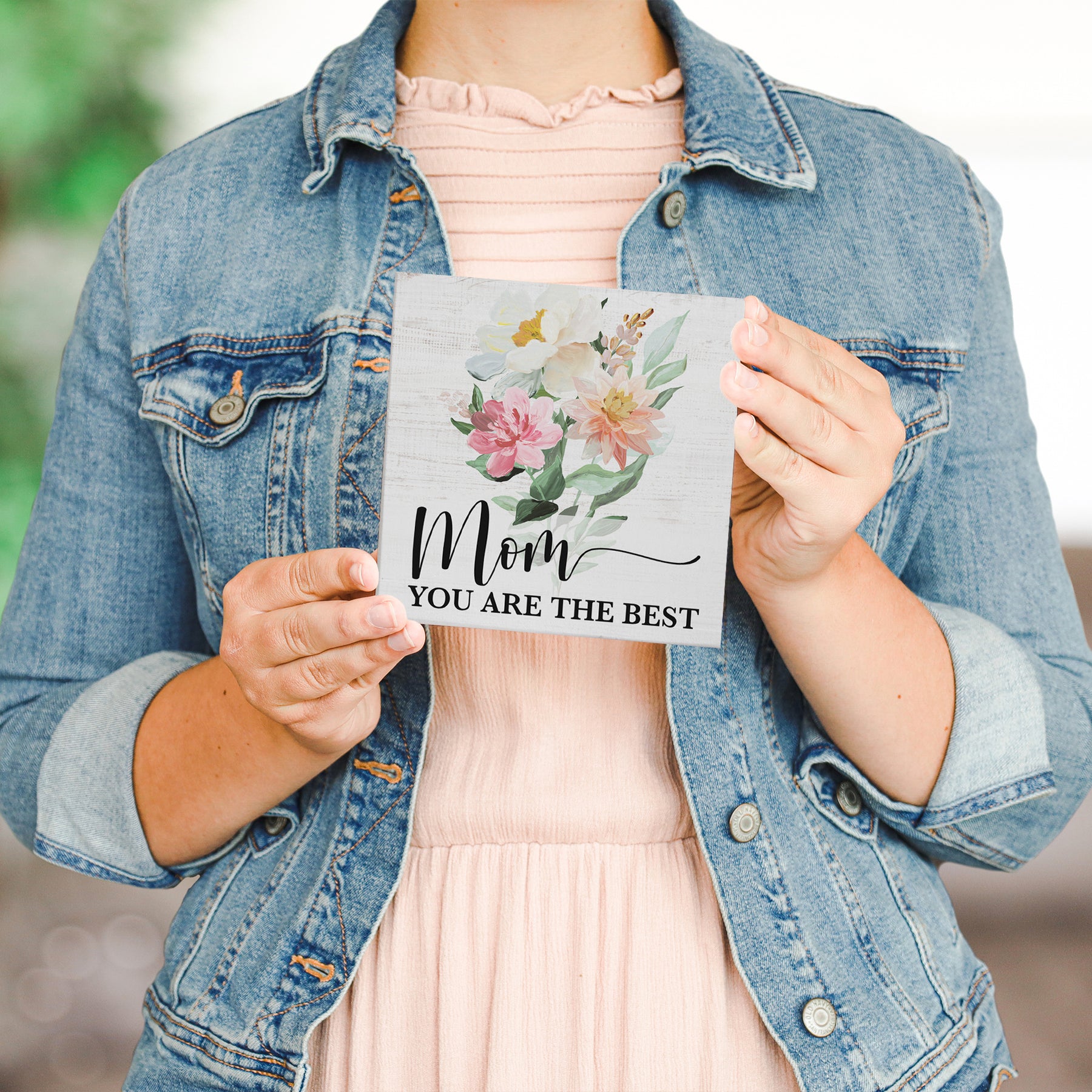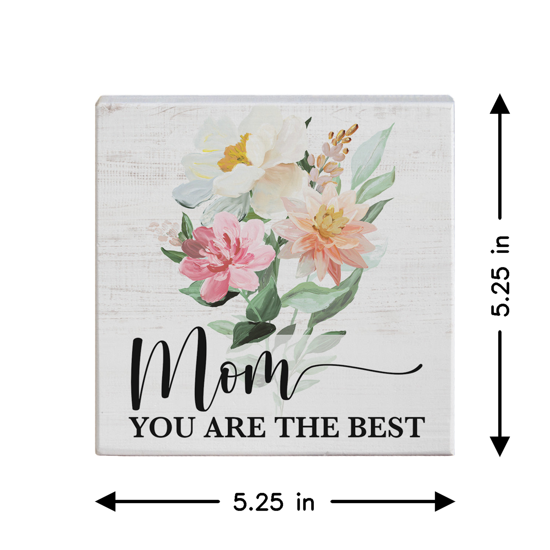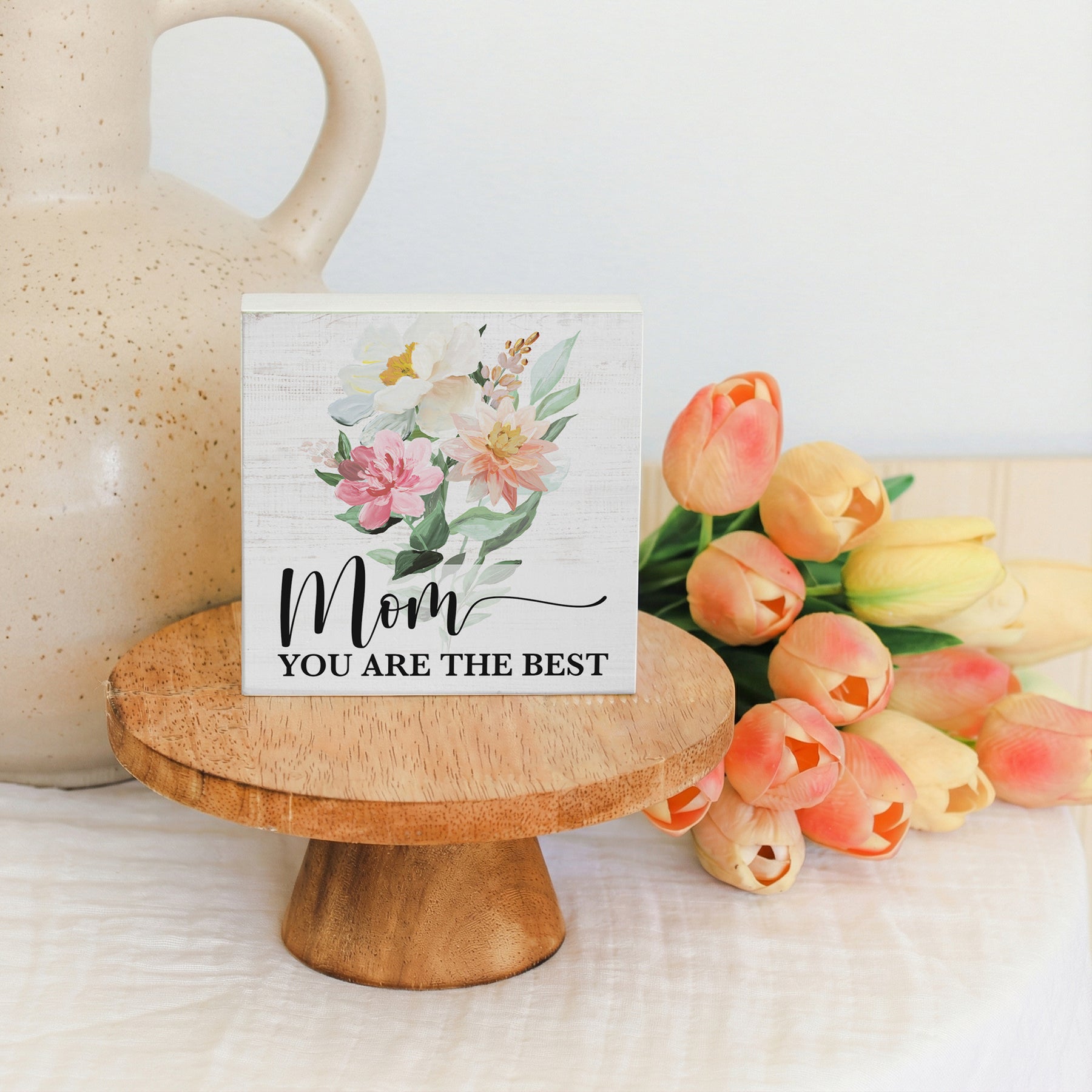 Warm, hand-painted florals in soft peachy and sage tones frame a heartfelt sentiment on this charming wooden shelf sitter. The artwork features delicate botanical brushwork with layered watercolor washes that create depth and movement across the piece, while elegant typography anchors the design with grace and sincerity. The composition invites a moment of reflection and appreciation, celebrating the special bond between mother and child. This thoughtful reminder shares "Mom You Are The Best."