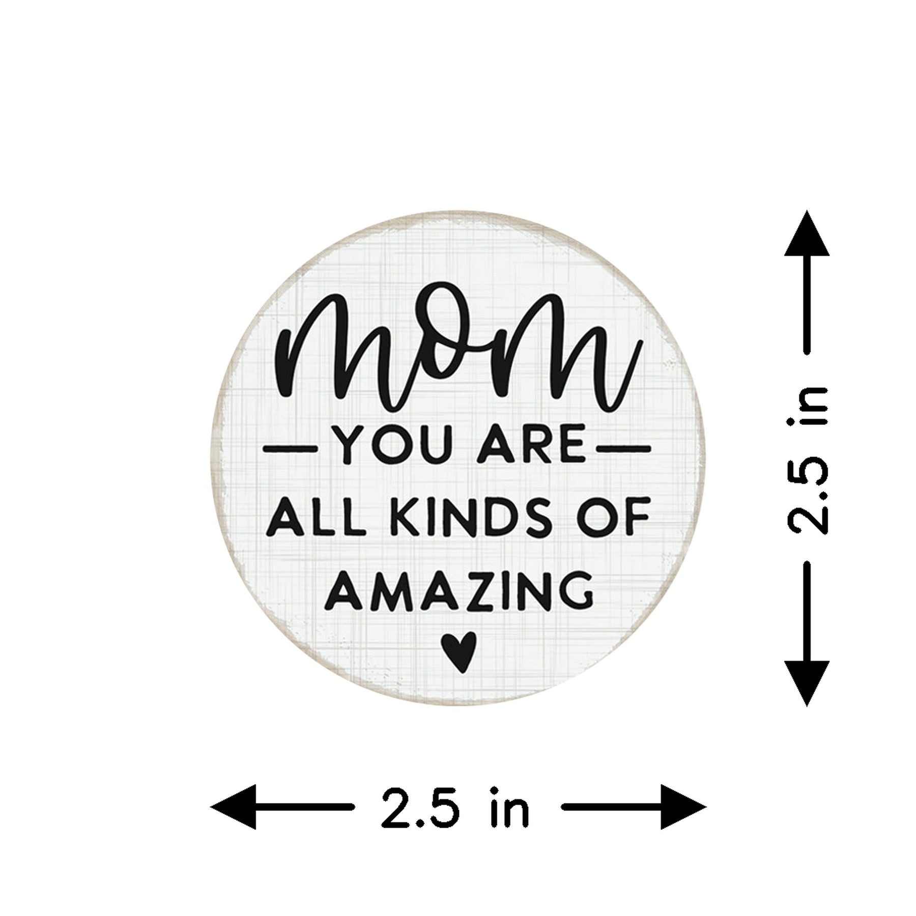 This charming round magnet celebrates the multifaceted wonder of motherhood with a warm, heartfelt design. Soft watercolor tones and hand-lettered typography create an inviting aesthetic that feels both contemporary and timeless, while a delicate heart accent adds a touch of genuine affection. The composition balances playful encouragement with sincere appreciation, making it an ideal piece for any space where a mother's strength, creativity, and love deserve to be honored. The message is beautifully hand-lettered in a friendly, modern script that catches the light and draws the eye. This heartfelt reminder shares "Mom — You Are — All Kinds Of Amazing ??"".