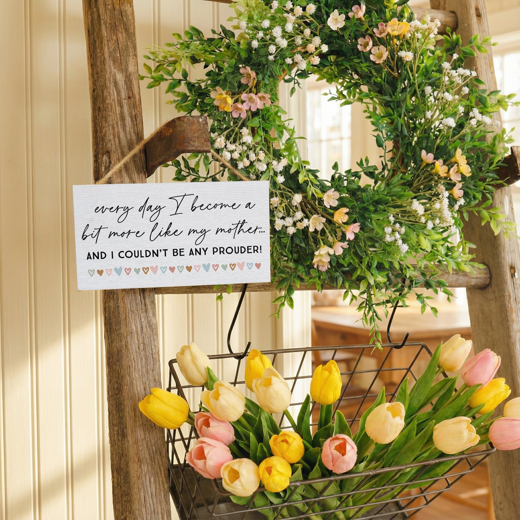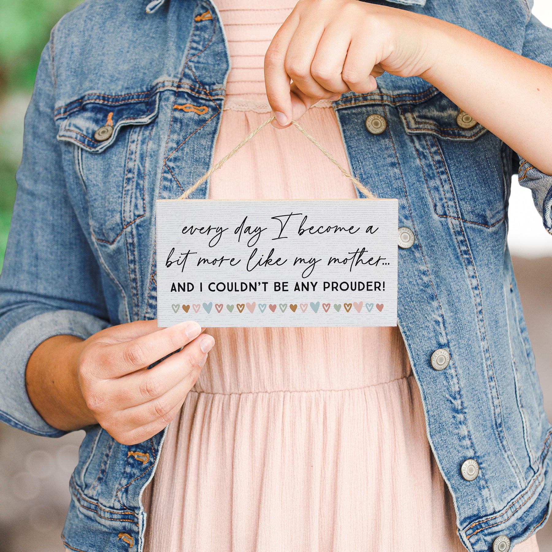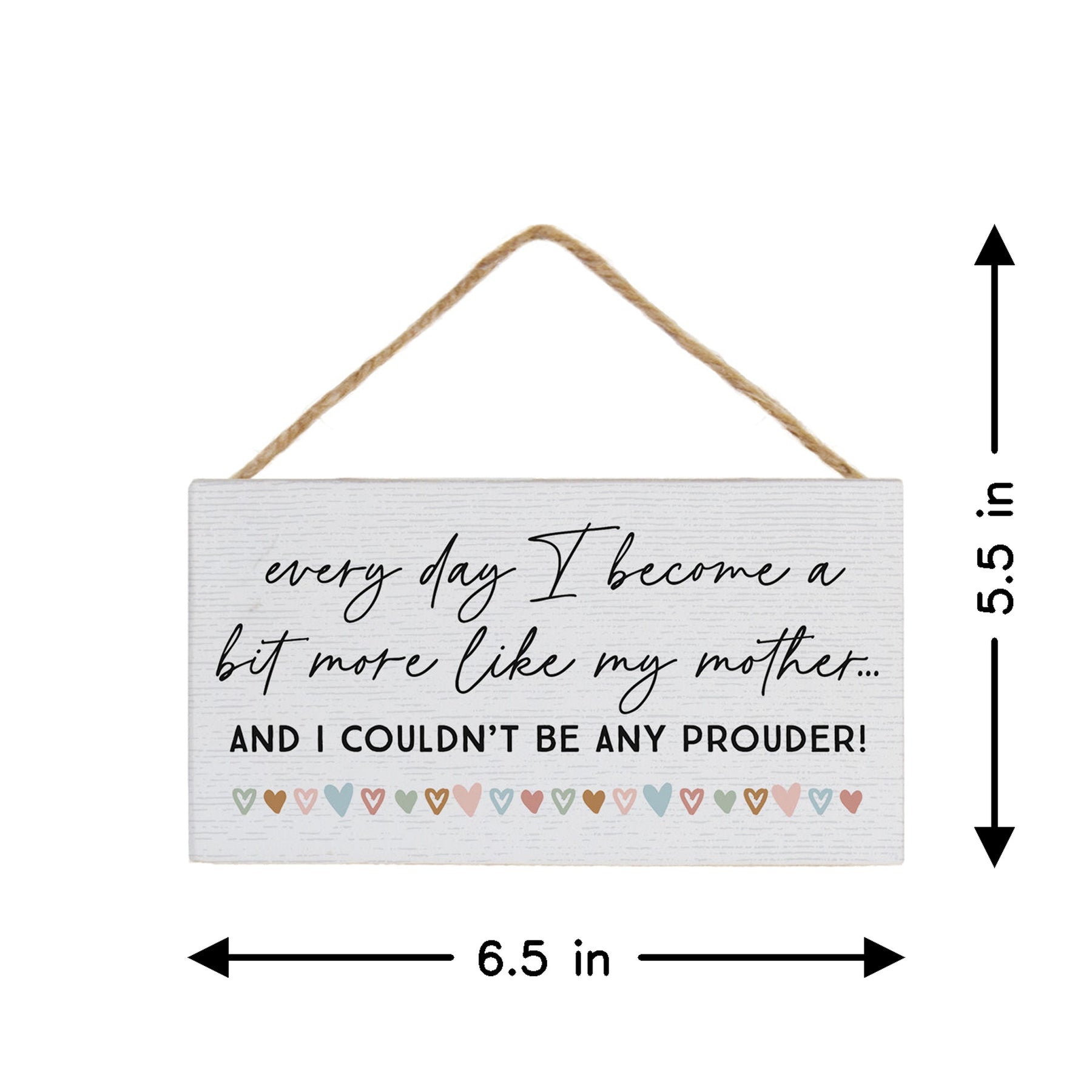 This charming wooden accent celebrates the beautiful bond between mother and daughter with a warm, heartfelt design. Rendered in soft, earthy tones against natural wood, the artwork features elegant typography that draws the eye with its clean, readable letterform—a style that feels both modern and timeless. The composition balances simplicity with sentiment, inviting quiet reflection on the meaningful ways we inherit our mothers' wisdom, grace, and strength. The message is hand-lettered in a graceful script that feels personal and genuine. A simple message that speaks volumes—"Every Day I Become A Bit More Like My Mother... And I Couldn't Be Any Prouder!"