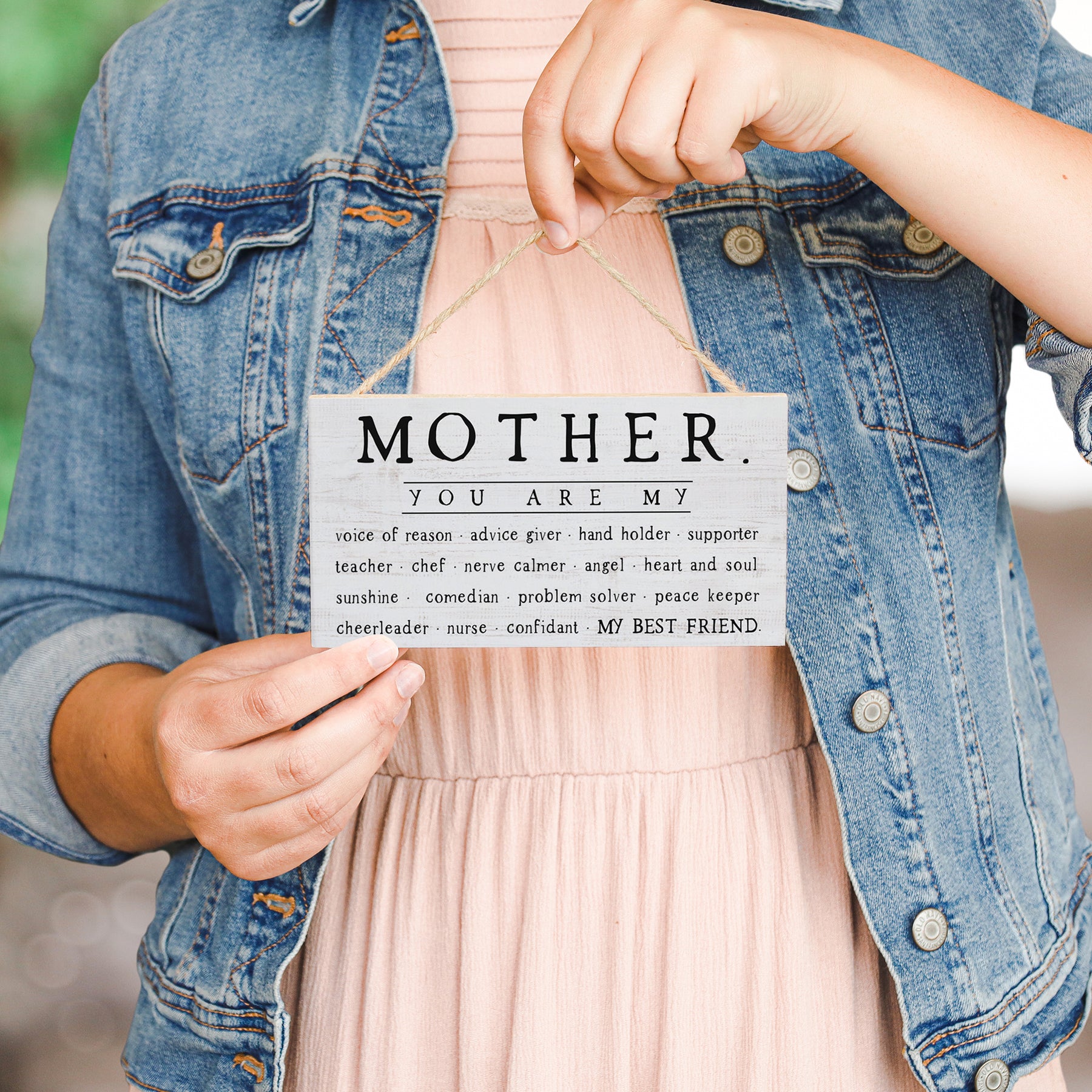 This charming wooden accent celebrates the multifaceted role mothers play in our lives. The design features warm, natural wood tones paired with elegant typography that lists the many ways a mother shows up—voice of reason, advice giver, hand holder, supporter, teacher, chef, nerve calmer, angel, heart and soul, sunshine, comedian, problem solver, peace keeper, cheerleader, nurse, confidant, and best friend. The composition balances simplicity with sentiment, using clean lettering arranged in a flowing, easy-to-read layout that invites reflection on the countless roles mothers embrace. Soft wood grain and rustic twine create an approachable, heartfelt aesthetic that feels both timeless and personal. This meaningful reminder shares the depth of a mother's love and influence.