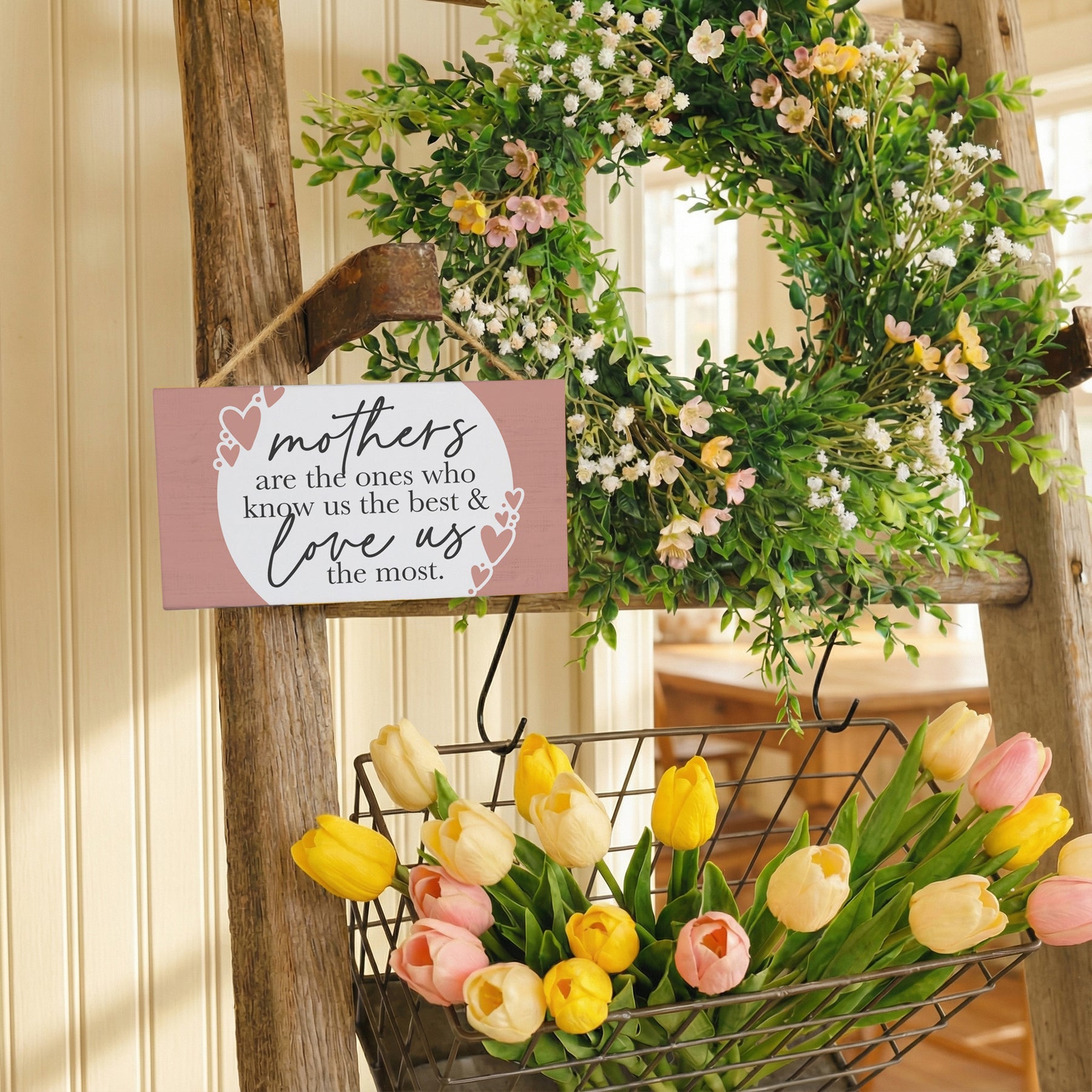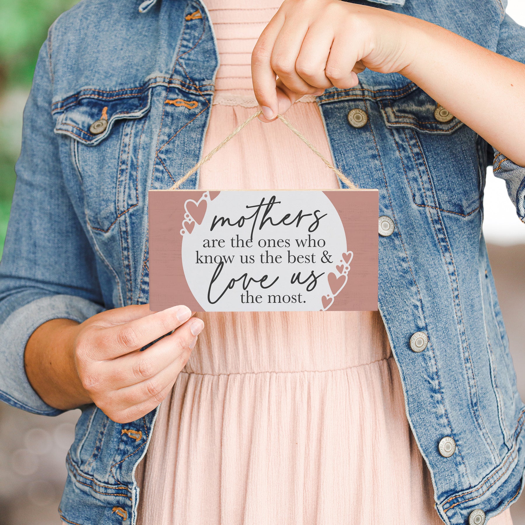 A tender celebration of maternal love rendered in soft, blush pink tones with elegant serif typography. The design features a heartfelt message in a classic, refined script that speaks to the profound bond between mother and child — capturing that unique knowing that only a mother possesses. The natural cedar wood grain peeks through the printed design, creating subtle depth and warmth that honors both the message and the material. This is a piece that invites reflection on gratitude, appreciation, and the irreplaceable role mothers play in our lives. The soft color palette and timeless typography create an atmosphere of tenderness and reverence, ideal for displaying year-round or gifting as a meaningful reminder. A simple message that speaks volumes — "Mothers Are The Ones Who Know Us The Best & Love Us The Most."