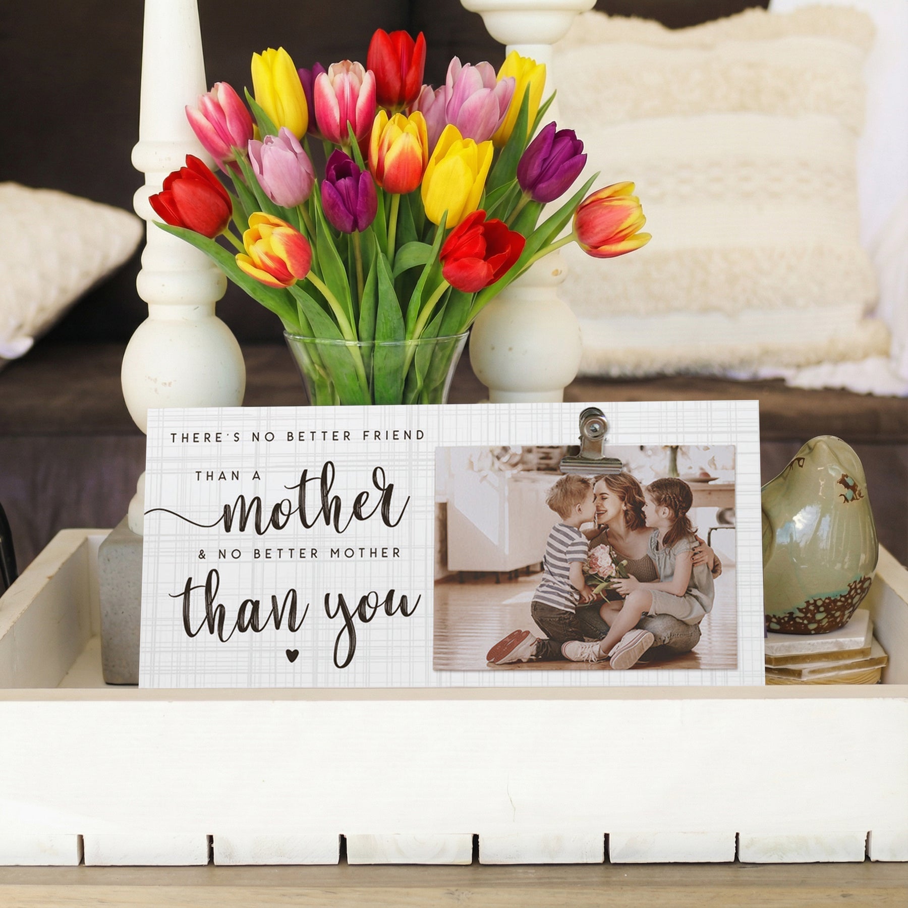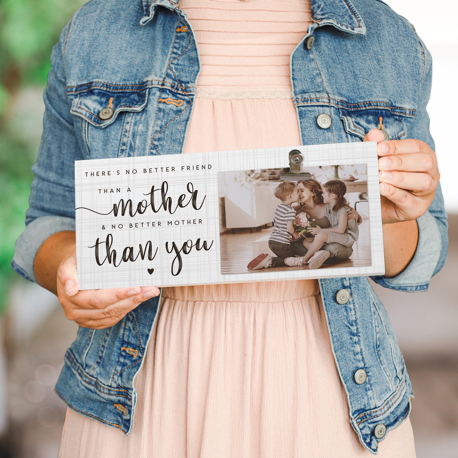 This charming picture clip celebrates the irreplaceable bond between mother and child with a warm, heartfelt design. The artwork features elegant, hand-lettered typography in rich, earthy tones set against the natural grain of high-end pine wood, creating a timeless aesthetic that honors maternal love and connection. The composition balances sentiment with sophistication, inviting viewers to pause and reflect on the profound relationship it commemorates. Soft brushwork and thoughtful spacing give the piece an artisanal quality that feels both personal and refined. This meaningful reminder shares "There's No Better Friend Than A Mother & No Better Mother Than You."