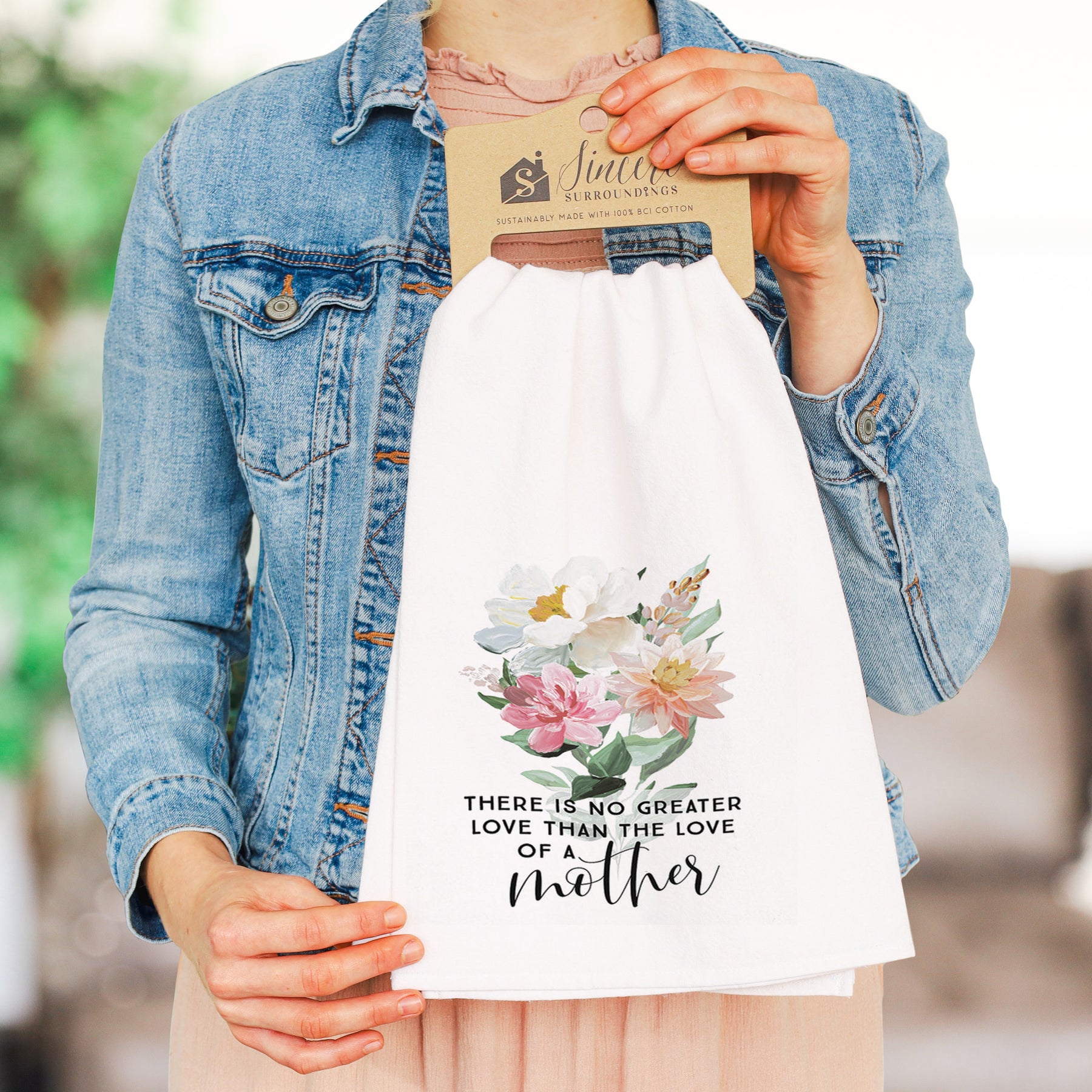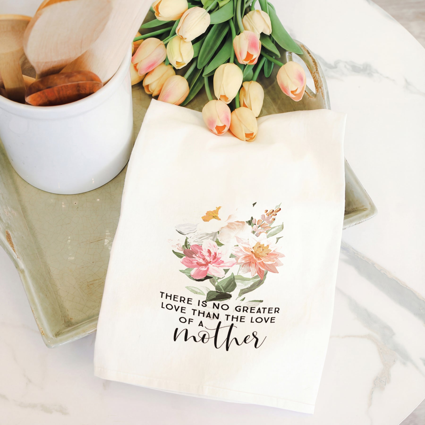 A warm celebration of maternal love rendered in elegant typography and soft, neutral tones. The design features hand-lettered script that flows gracefully across premium cotton, creating an intimate, heartfelt composition. The color palette—warm creams and gentle grays—evokes comfort and timelessness, while the carefully balanced layout draws the eye naturally across the fabric. This is more than a kitchen essential; it's a daily reminder of the profound bond between mother and child. The artwork invites quiet reflection each time you reach for it, transforming an everyday item into a meaningful keepsake. A simple message that speaks volumes—"There Is No Greater Love Than The Love Of A Mother."