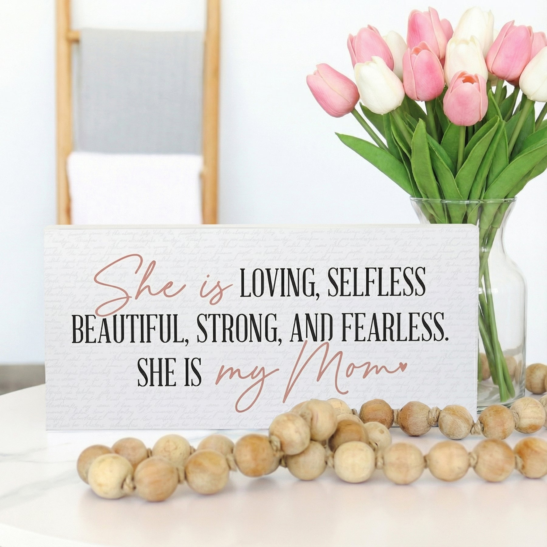 This beautiful wooden sign celebrates the extraordinary woman who is a mother—loving, selfless, beautiful, strong, and fearless. The design features elegant, hand-lettered typography in a warm, inviting style that captures the essence of maternal strength and grace. Soft neutral tones and clean composition create a serene, heartfelt aesthetic that resonates with anyone who wants to honor the remarkable women in their lives. The artwork speaks to the multifaceted nature of motherhood, balancing tenderness with resilience. This meaningful reminder shares "She Is Loving, Selfless Beautiful, Strong, And Fearless. She Is My Mom."