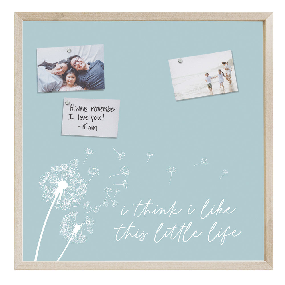Handcrafted and made with quality wood, steel, and cloth. Comes with 4 small, strong magnets to display your favorite photos or memories. A deep, lip-on frame allows for easy hanging or sitting. Dimensions are 24 x 24 x 1.5. 128 oz. Proudly designed, printed, and made in the USA by Sincere Surroundings.