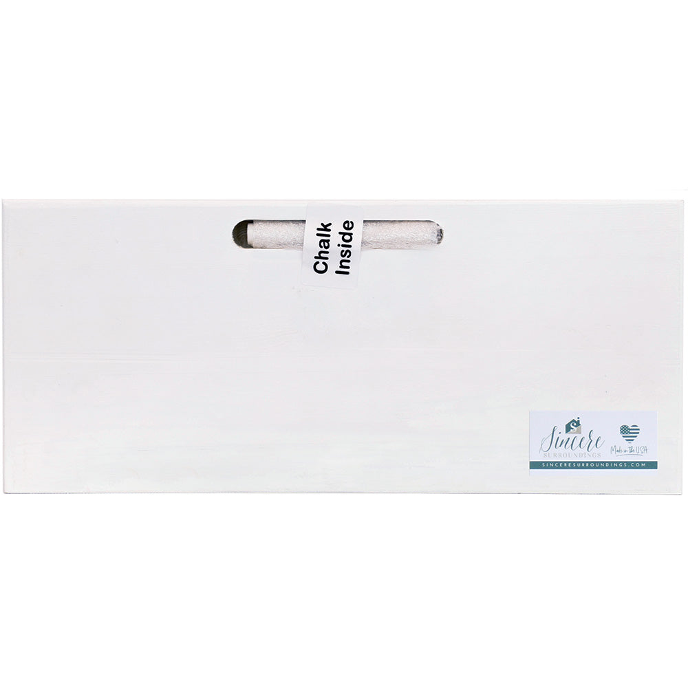 This piece is composed of high-end pine wood and a vinyl chalk application. Wipe with water and reuse as many times as you want. Each piece comes with a piece of chalk which can be stored in the back. Display this fun and functional tabletop piece in your home and watch the smiles grow. Dimensions are 5.5 x 12 x 1.25. Product weight 20 oz. Proudly designed, made, and printed in the USA with solid wood, by Sincere Surroundings.