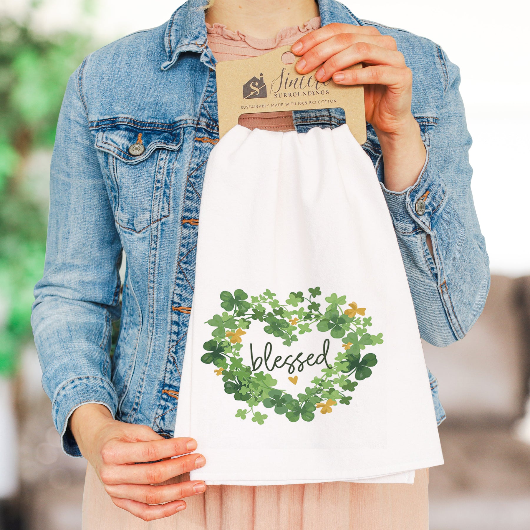 This charming tea towel celebrates Irish heritage with a beautiful clover heart design rendered in soft, earthy tones. The illustration features a delicate four-leaf clover nestled within a warm, hand-drawn heart shape, creating a symbol of luck, love, and Irish pride that feels both timeless and contemporary. The color palette—warm neutrals accented with touches of green—evokes the natural beauty of the Irish countryside, while the organic linework gives the design an artisanal, heartfelt quality. The composition is perfectly centered, making this piece as lovely to display as it is functional. A simple message that speaks volumes—"Blessed."