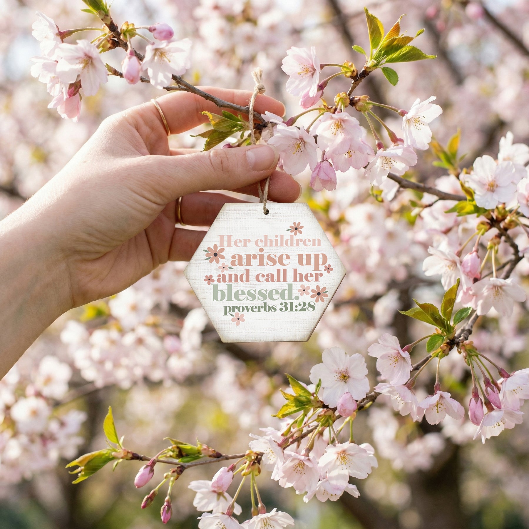 A tender illustration celebrates the profound bond between mother and child, rendered in warm, earthy tones that evoke both strength and grace. The hexagonal wood shape frames delicate lettering in a refined serif font, creating an elegant composition that feels both timeless and deeply personal. The natural wood grain peeks through the printed design, adding organic texture and authenticity to this meaningful piece. Soft watercolor-like washes of gold and cream tones blend across the surface, creating a gentle luminosity that draws the eye inward. The overall aesthetic balances modern minimalism with traditional craftsmanship, inviting quiet reflection on motherhood, faith, and family legacy. A meaningful message that shares "Her Children Arise Up And Call Her Blessed. Proverbs 31:28."