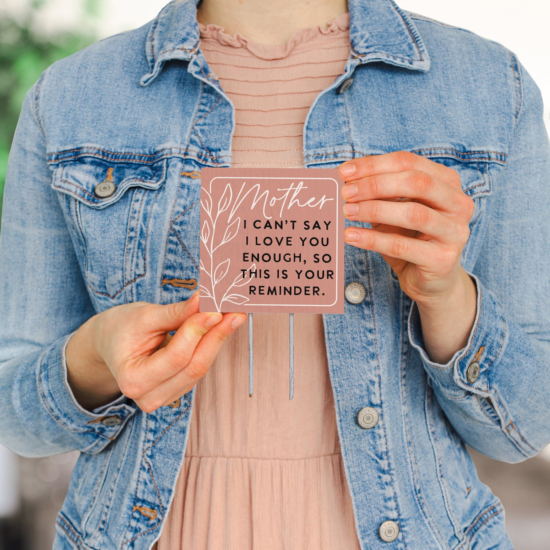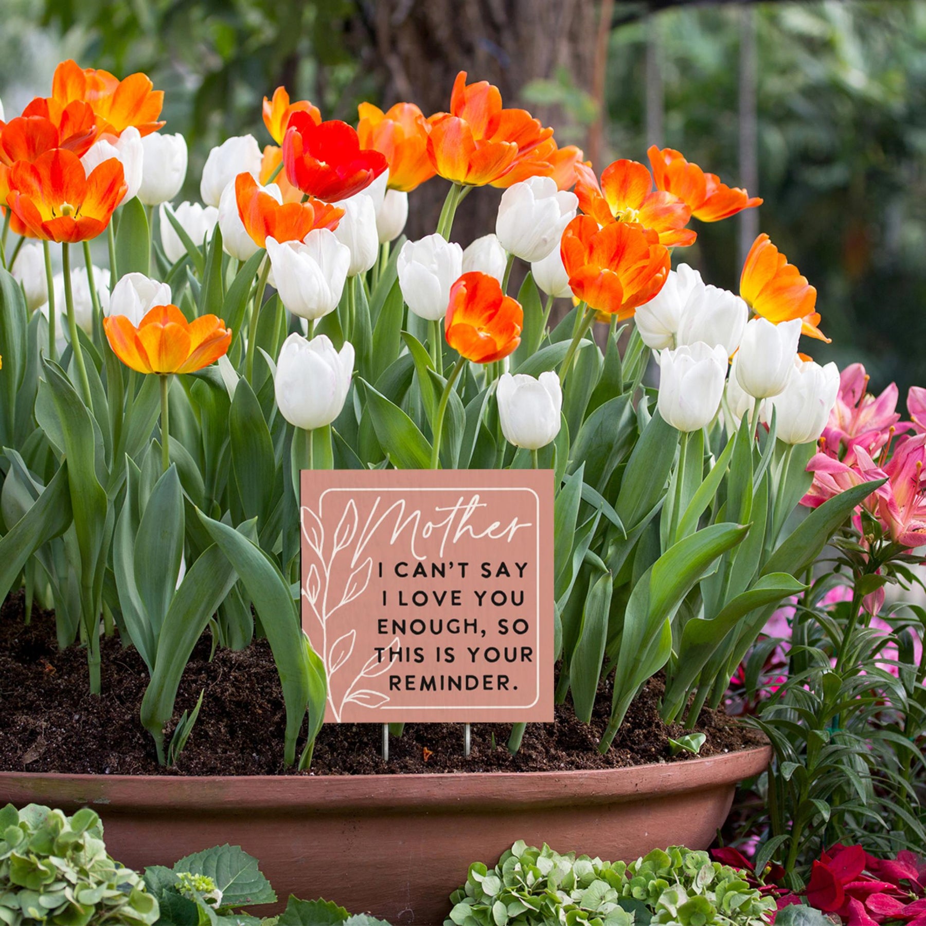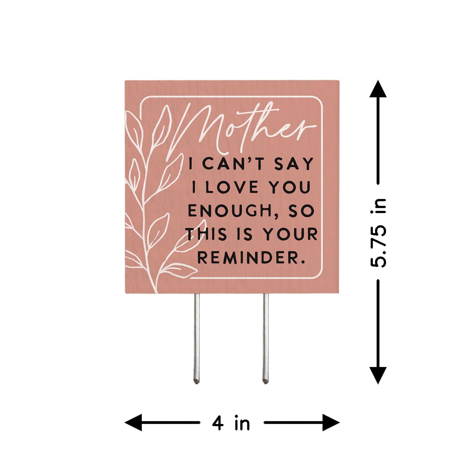 A heartfelt plant stake designed to celebrate the bond between mother and child, this piece features warm, elegant typography set against a soft, natural wood tone. The sentiment unfolds across the stake in a gentle, readable script that invites reflection and gratitude. Rendered in a style that feels both timeless and intimate, the design captures the depth of a mother's love—a visual reminder of affection that words alone cannot fully express. This meaningful message shares "Mother I Can't Say I Love You Enough, So This Is Your Reminder."