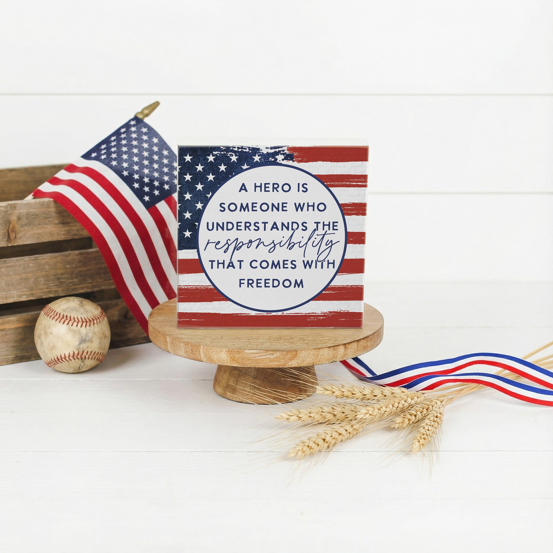 This striking wooden sign celebrates the profound connection between freedom and responsibility through bold, patriotic typography. The design features clean, confident lettering set against a warm pine wood background, creating a timeless aesthetic that speaks to American values and civic pride. The composition is both modern and meaningful, with the message rendered in a style that commands attention while maintaining elegant simplicity. The natural wood grain peeks through, adding warmth and authenticity to this piece of art that honors those who understand the weight of liberty. A simple yet powerful reminder that shares "A Hero Is Someone Who Understands The Responsibility That Comes With Freedom."