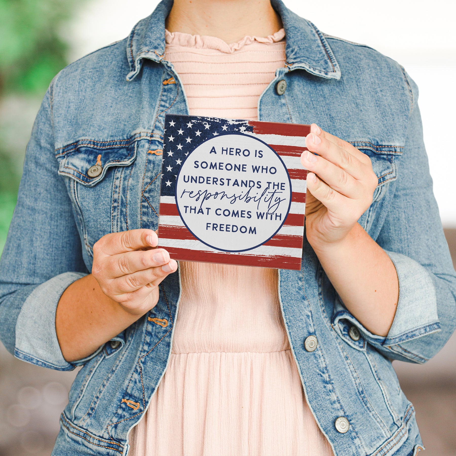 This hand-crafted shelf sitter is designed to stand proudly on tabletops, desks, shelves, and entryways—anywhere you want to display a meaningful statement about American values. Its compact, squared format makes it ideal for home offices, living rooms, patriotic displays, or any space that celebrates civic responsibility and freedom.