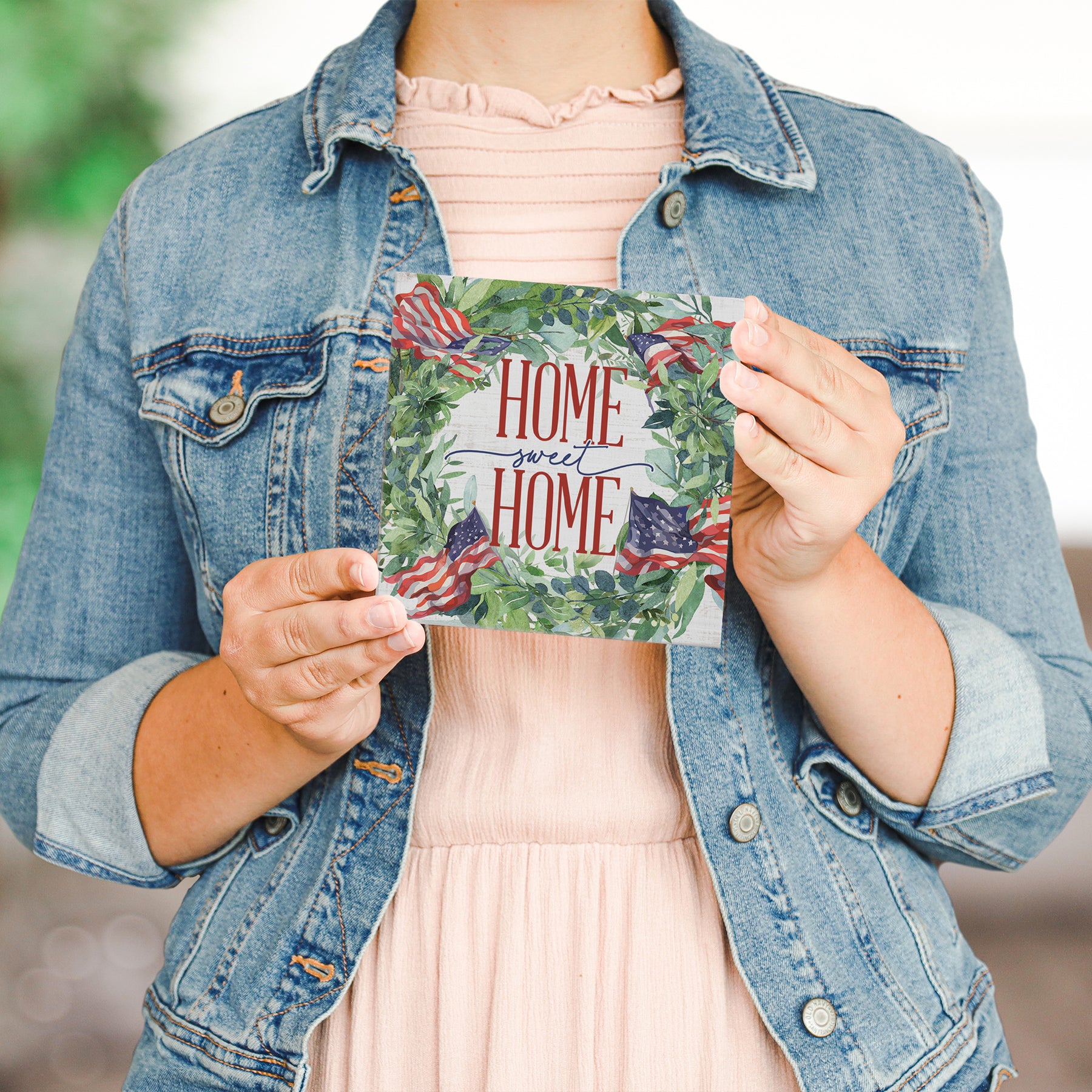 This charming wooden shelf sitter celebrates American patriotism with a delightful wreath design accented by a charming flag motif. The composition features warm, inviting colors that evoke classic Americana—think patriotic reds, whites, and blues—arranged in a cheerful, folk-art style that brings a smile to any room. The lettering sits prominently within the wreath, rendered in a friendly, readable style that captures the joy of home and belonging. A playful message that speaks to the heart of American pride — "Home Sweet Home".
