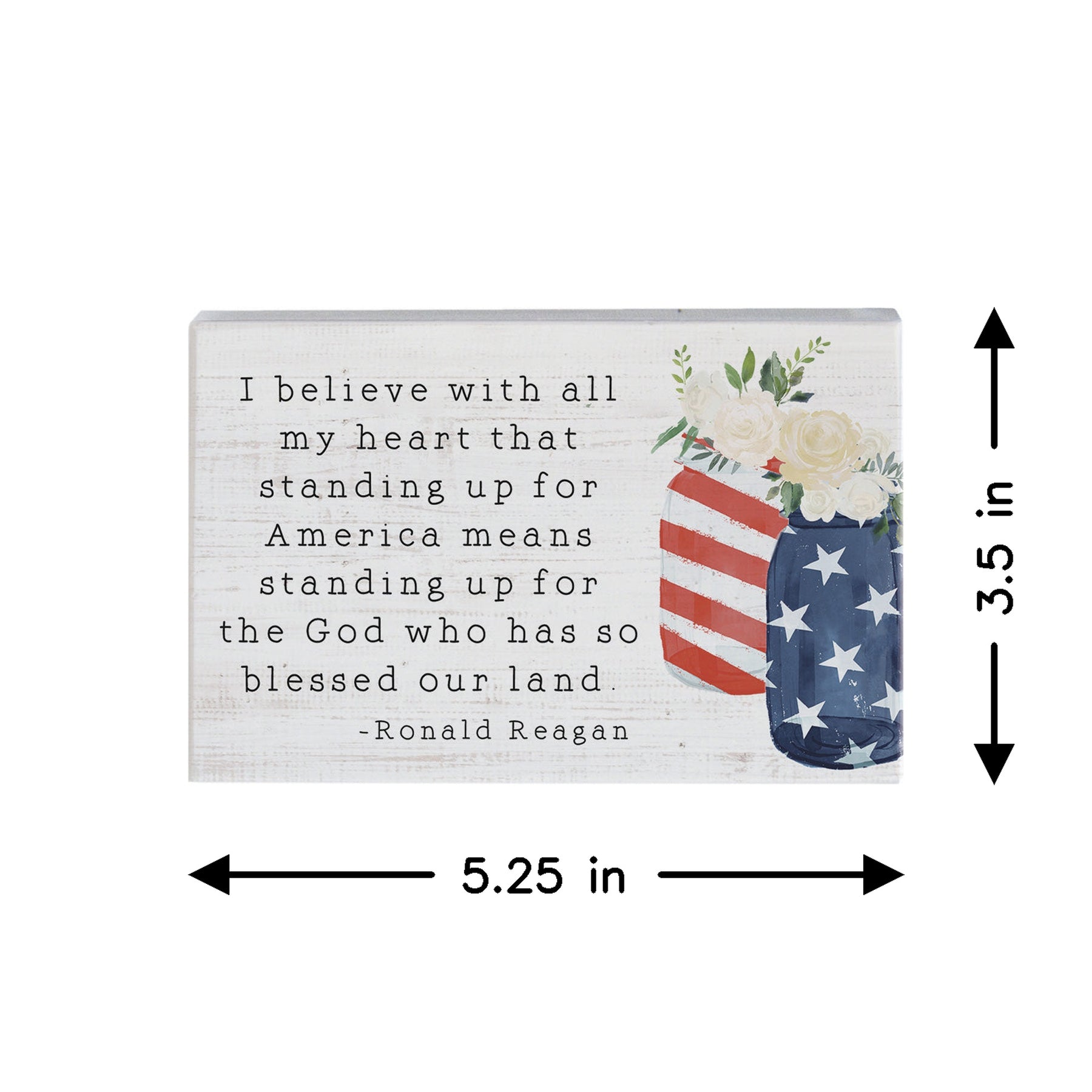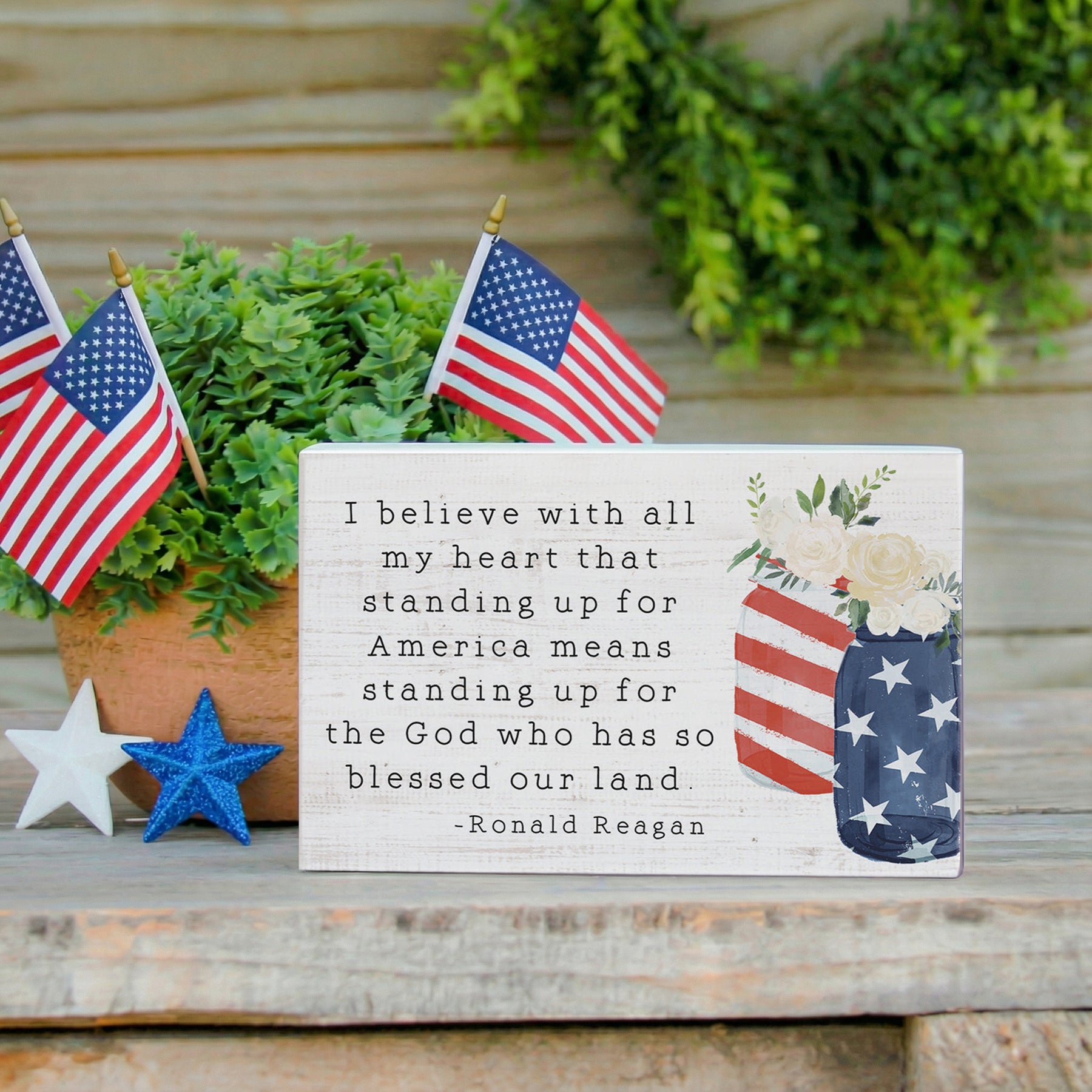 This striking wooden sign celebrates American patriotism through a powerful message of faith and national pride. The design features bold, authoritative typography set against a clean, natural wood background, creating a timeless aesthetic that speaks to deeply held values. The composition balances strength and reverence, with the text presented in a way that commands attention while maintaining an elegant, gallery-quality appearance. The warm wood tones provide a grounding visual foundation, while the carefully chosen lettering style conveys conviction and sincerity. This is far more than a decorative accent—it's a statement piece that honors the intersection of faith, freedom, and American heritage. A meaningful message that shares "I Believe With All My Heart That Standing Up For America Means Standing Up For The God Who Has So Blessed Our Land. -Ronald Reagan".