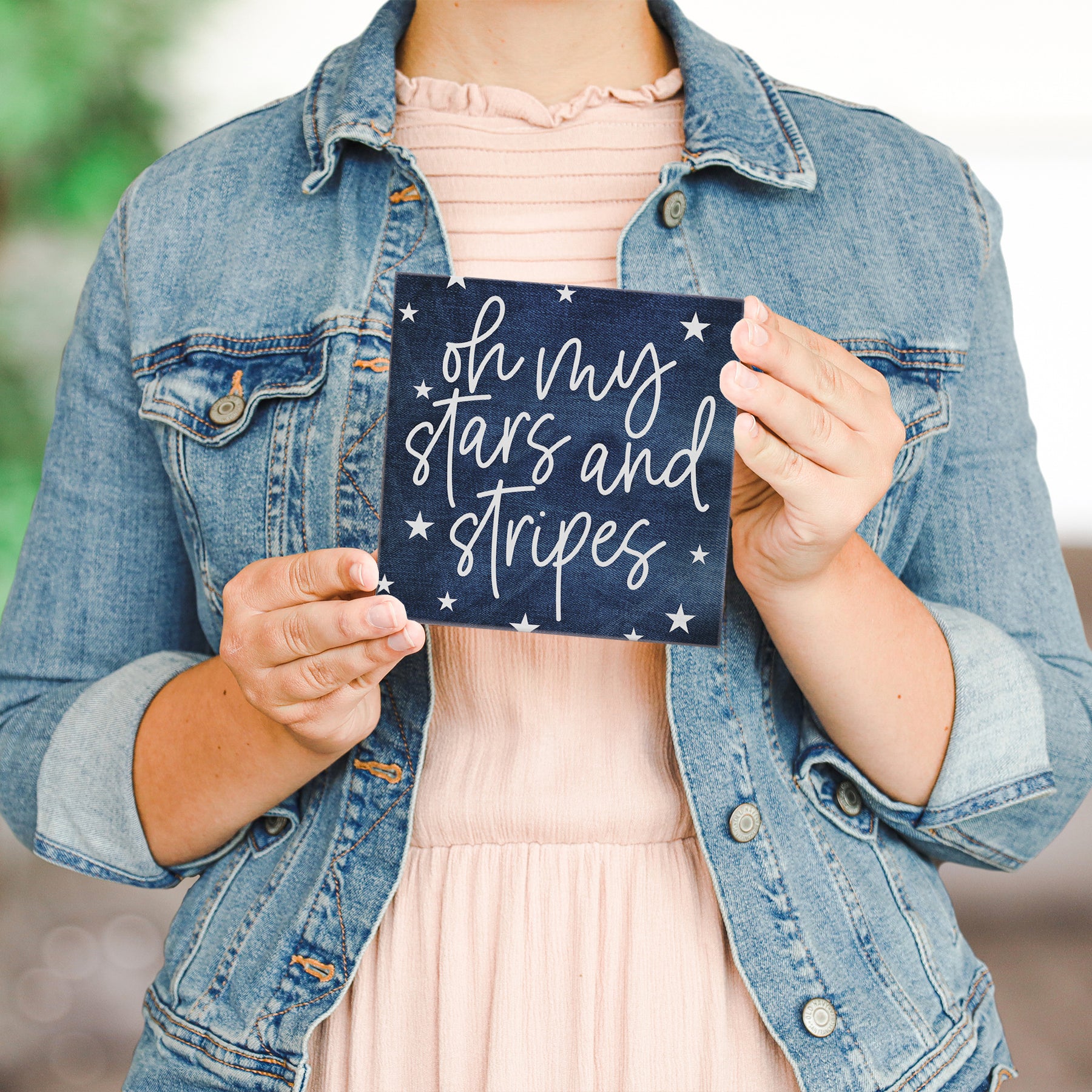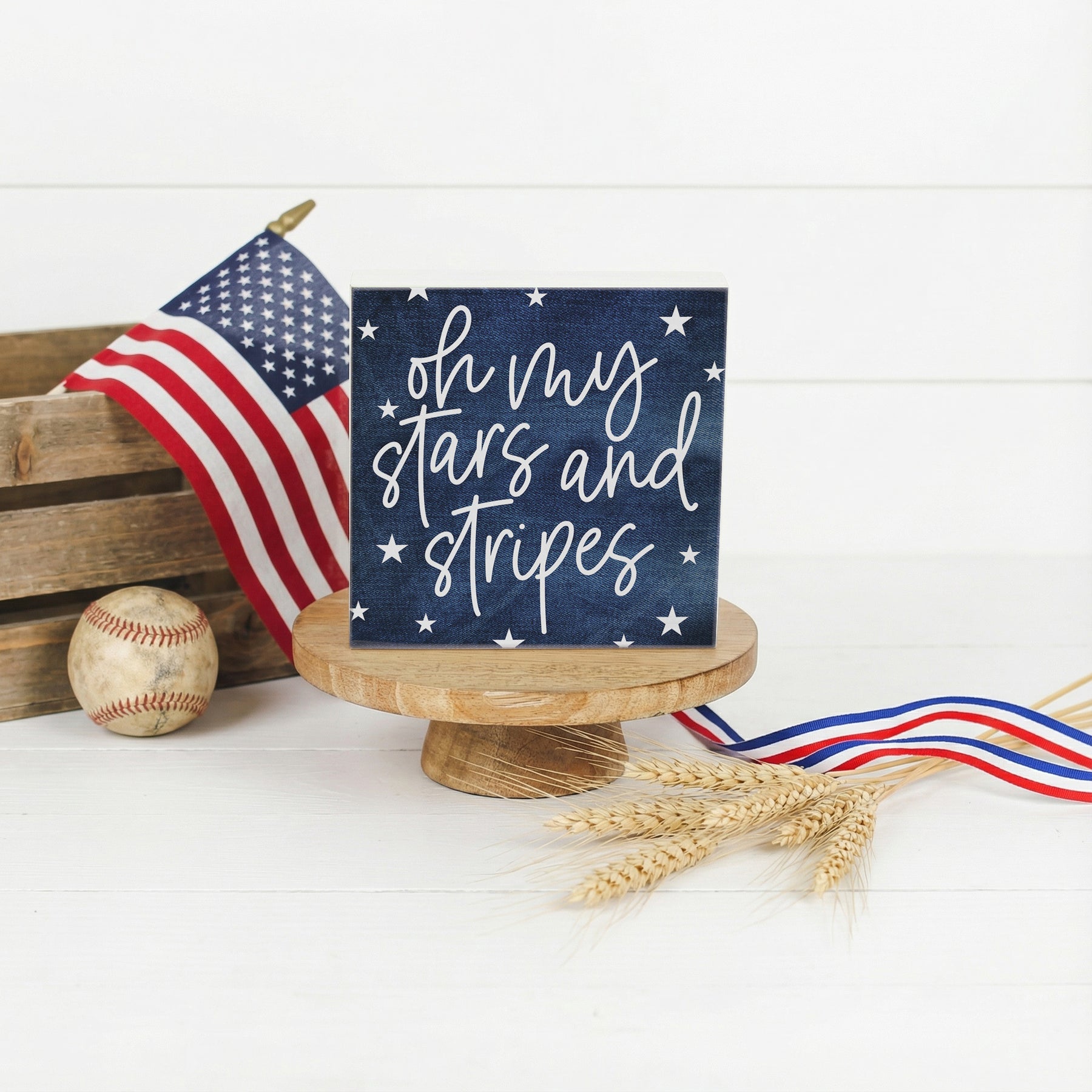 This charming wooden sign celebrates American pride with a bold, patriotic design rendered in rich denim tones and classic red accents. The artwork features hand-lettered typography paired with iconic star imagery, creating a composition that feels both timeless and contemporary. The color palette—deep indigo, crisp white, and vibrant red—evokes the spirit of American heritage, while the clean, modern layout ensures the piece reads beautifully from any angle. Whether displayed on a desk, shelf, or tabletop, the design invites a quiet moment of reflection on national pride and identity. A playful message that shares "Oh My Stars And Stripes".