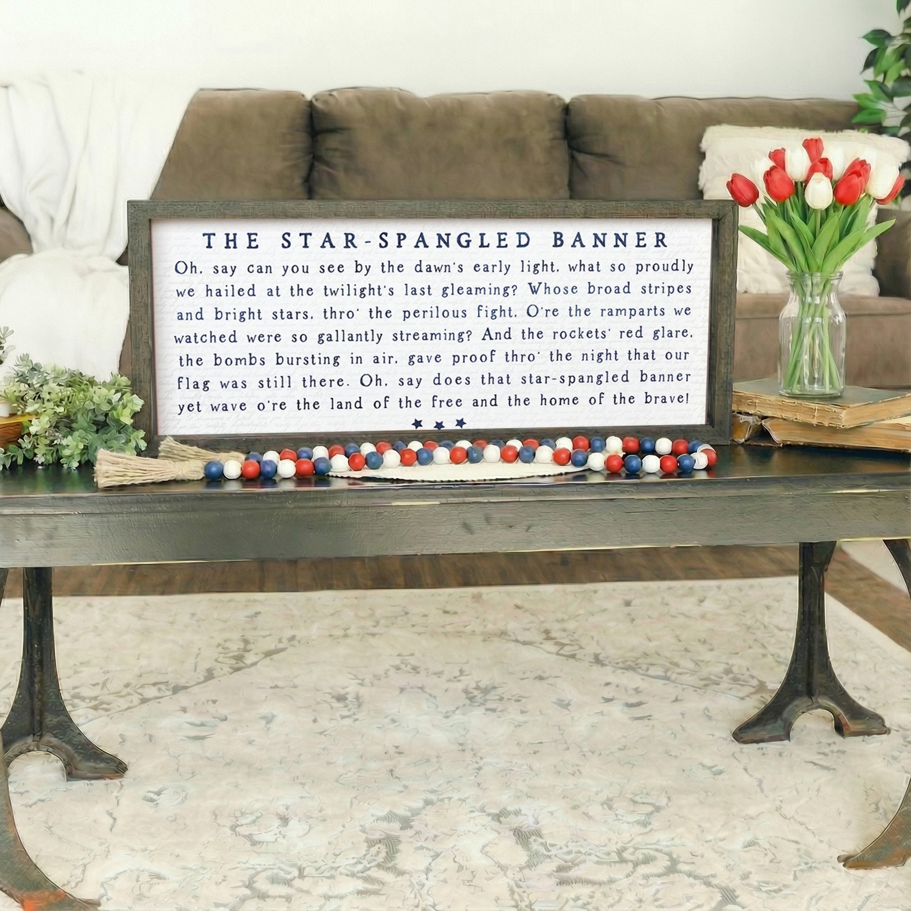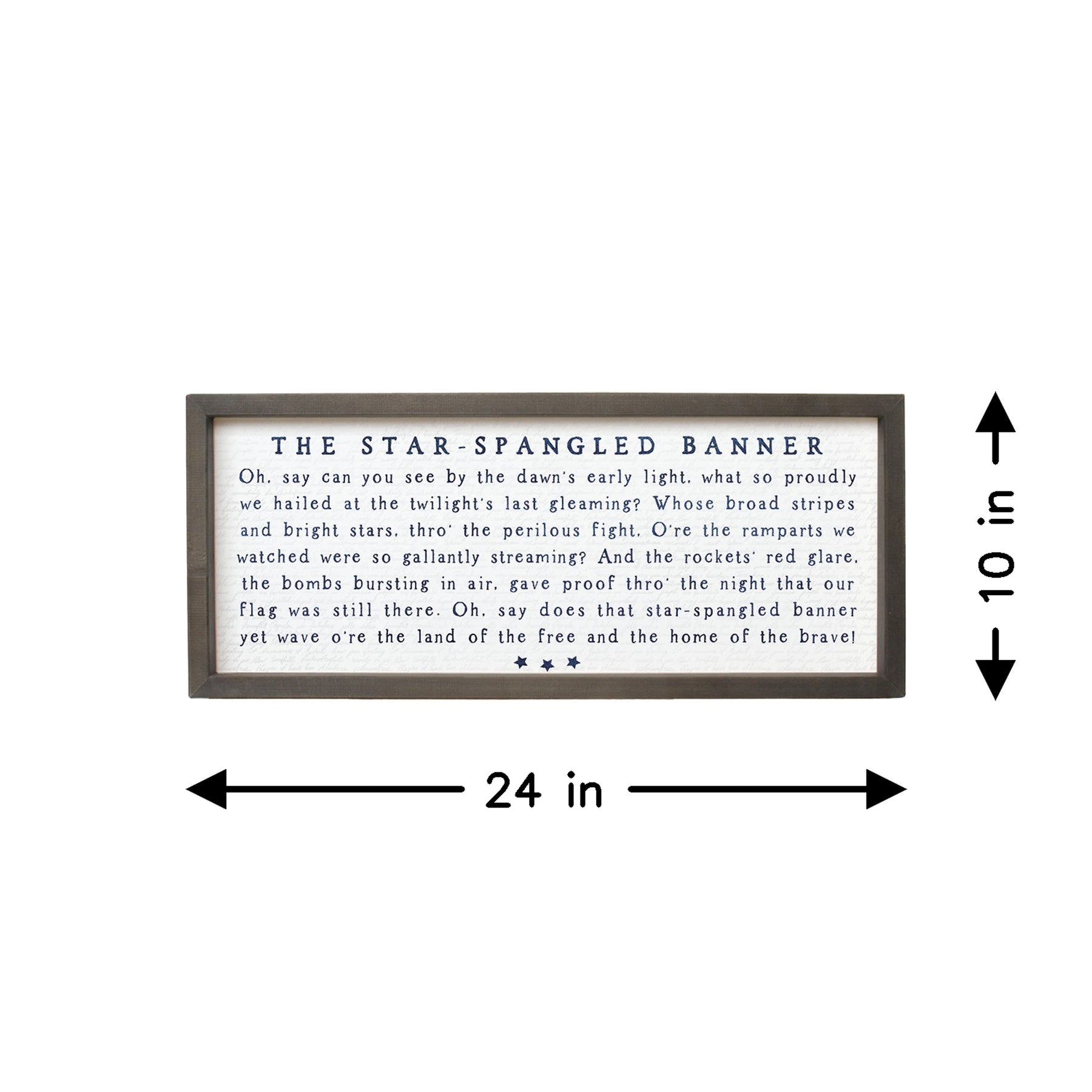 This striking wall art celebrates American patriotism through the iconic words of "The Star-Spangled Banner," rendered in a sophisticated typographic composition that honors the nation's enduring spirit. The design features the complete lyrics of Francis Scott Key's historic anthem, arranged in carefully balanced typography that draws the eye across the piece with a sense of reverence and pride. A neutral, elegant color palette—likely featuring deep tones against a lighter background—allows the powerful words to command attention while maintaining the refined aesthetic of farmhouse and patriotic décor. The typography itself becomes the artwork, transforming these stirring words into a visual meditation on freedom, courage, and national identity. Each phrase builds upon the last, creating a rhythmic flow that mirrors the emotional arc of the anthem itself. This is more than decoration; it's a tribute to American history and values, inviting viewers to pause and reflect on the sacrifice and resilience embedded in these timeless words.