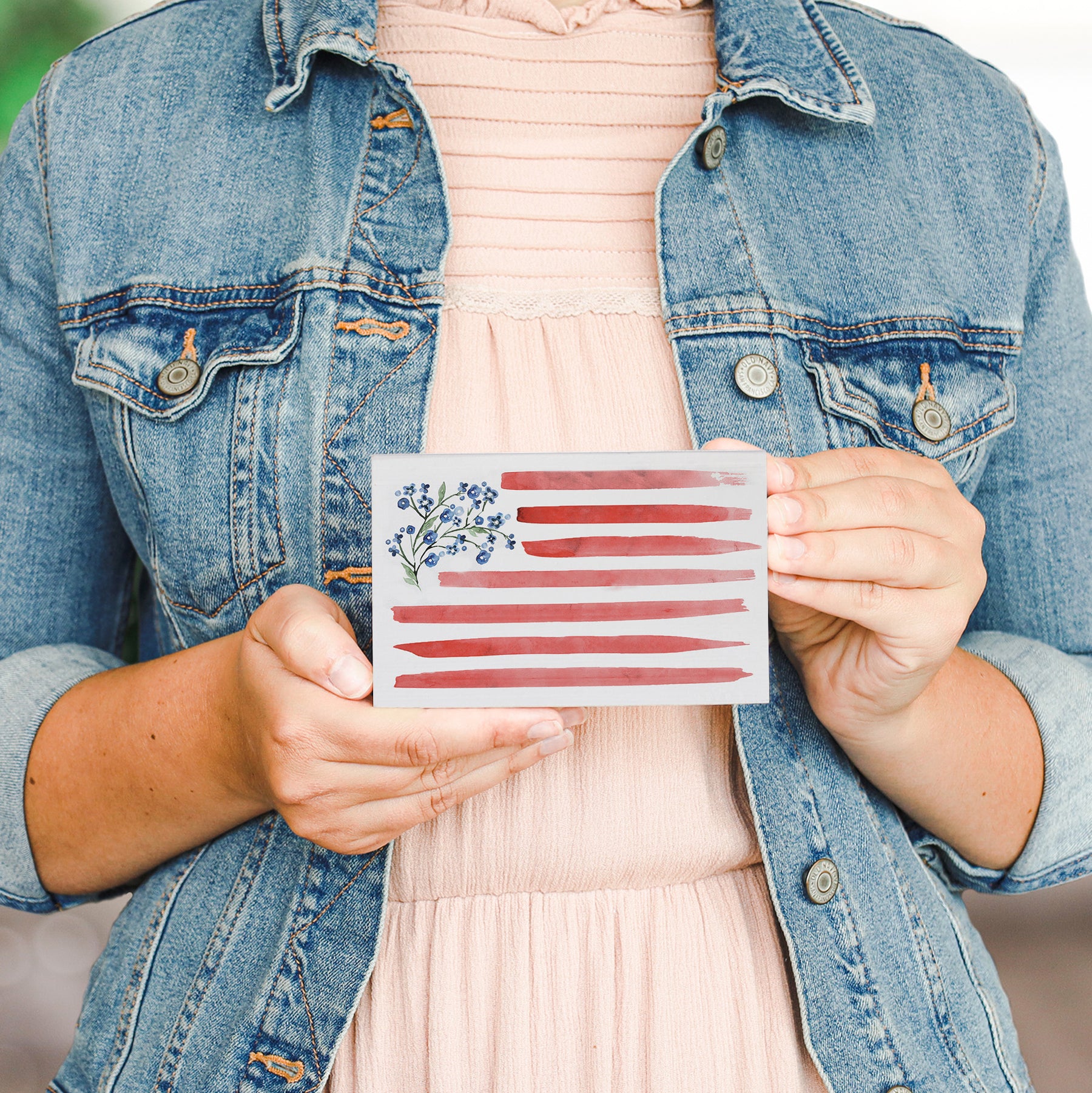 A vibrant watercolor illustration of the American flag blooms across this charming shelf sitter, rendered in soft floral tones that transform patriotic symbolism into a celebration of natural beauty. Delicate flowers in reds, whites, and blues merge with gentle brushstrokes and organic washes, creating a composition that feels both artistic and heartfelt. The watercolor technique softens the traditional flag imagery, inviting a fresh perspective on American pride—one rooted in appreciation for the natural world and the beauty that surrounds us. This is a thoughtful reminder that patriotism can be expressed through art, nature, and everyday moments of quiet reflection.