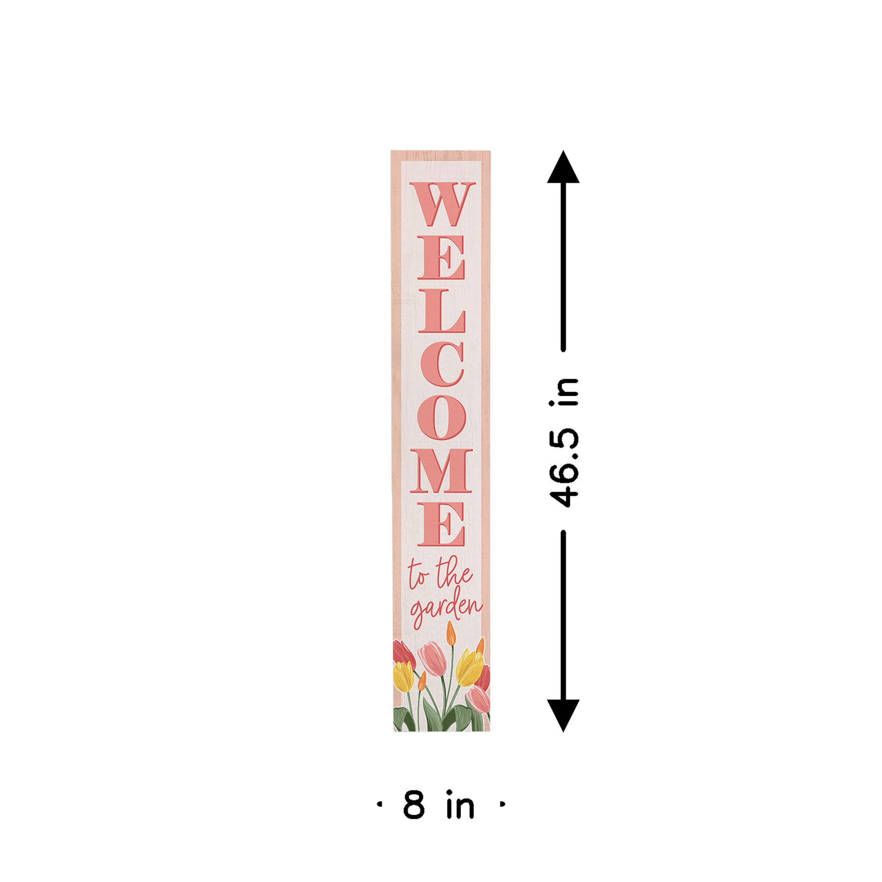 This charming weatherproof porch board features a vibrant garden scene bursting with spring color and life. Delicate tulips in warm reds, soft pinks, and cheerful yellows bloom across the composition, rendered in a fresh watercolor style that captures the gentle, organic beauty of a flourishing garden. The illustration is anchored by elegant, hand-lettered typography in a welcoming serif font, positioned prominently to greet visitors with warmth and hospitality. The soft, natural palette—from the rich green foliage to the pale cream background—creates an inviting, peaceful atmosphere that celebrates the joy of springtime and outdoor living. The artwork radiates the simple pleasure of garden moments and the comfort of home, making it an ideal welcome for any entryway or garden-facing space. A meaningful message that shares "Welcome To The Garden."