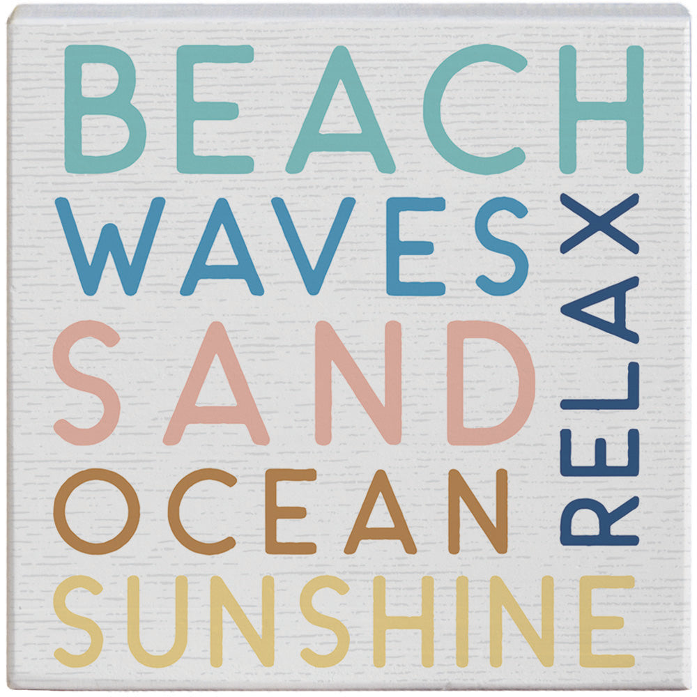 Text found in image: BEACH WAVES SAND OCEAN SUNSHINE RELAX