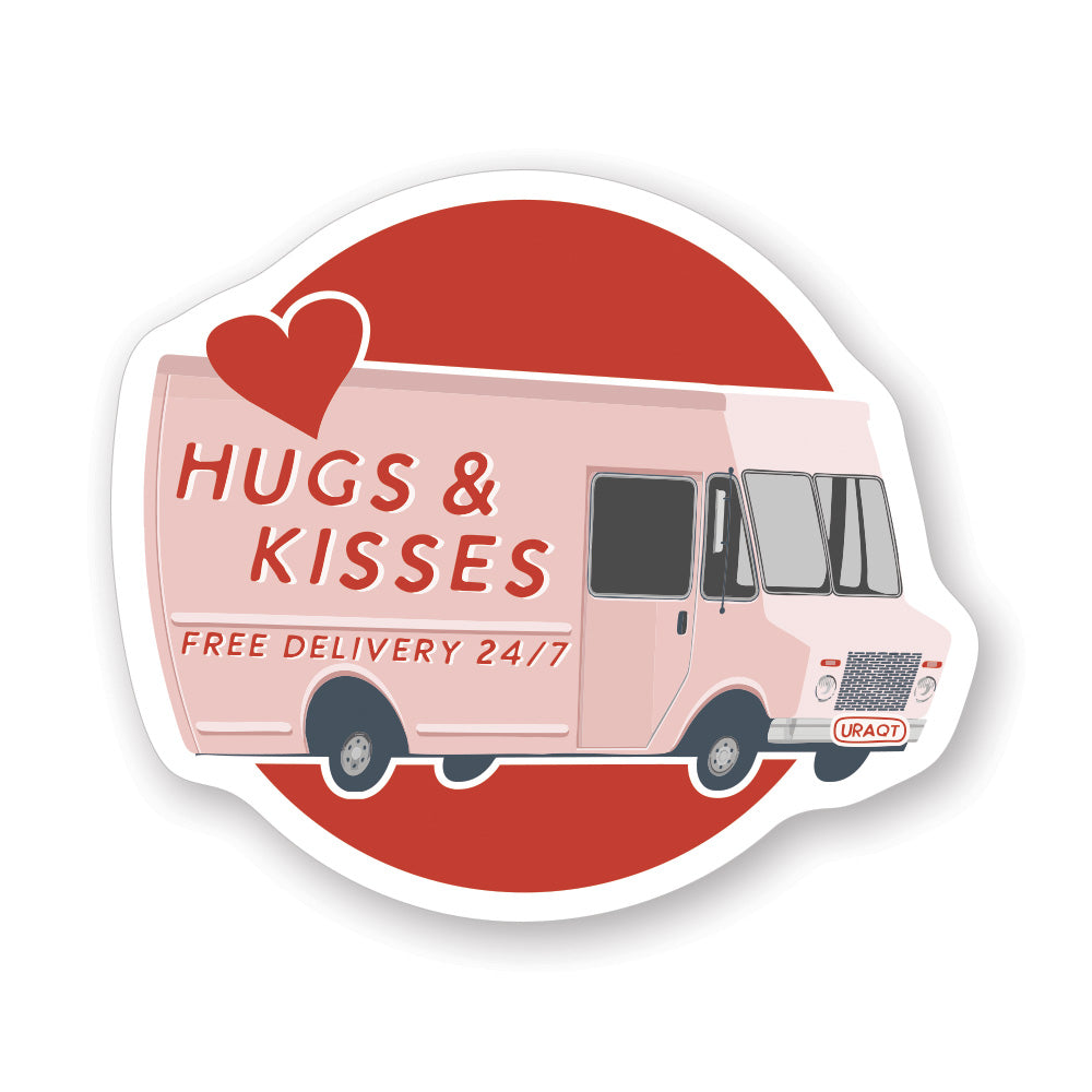 A charming vintage-inspired delivery truck illustration captures the playful spirit of Valentine's Day with its cheerful design and warm color palette. The artwork features a classic truck rendered in soft, nostalgic tones, adorned with hand-lettered typography that celebrates love and connection. The composition evokes a sense of whimsy and romance, ideal for those who appreciate quirky, heartfelt imagery. Bold, friendly lettering sits prominently across the design, creating a lighthearted mood that makes you smile. A playful message that shares "Hugs & Kisses Free Delivery 24/7".