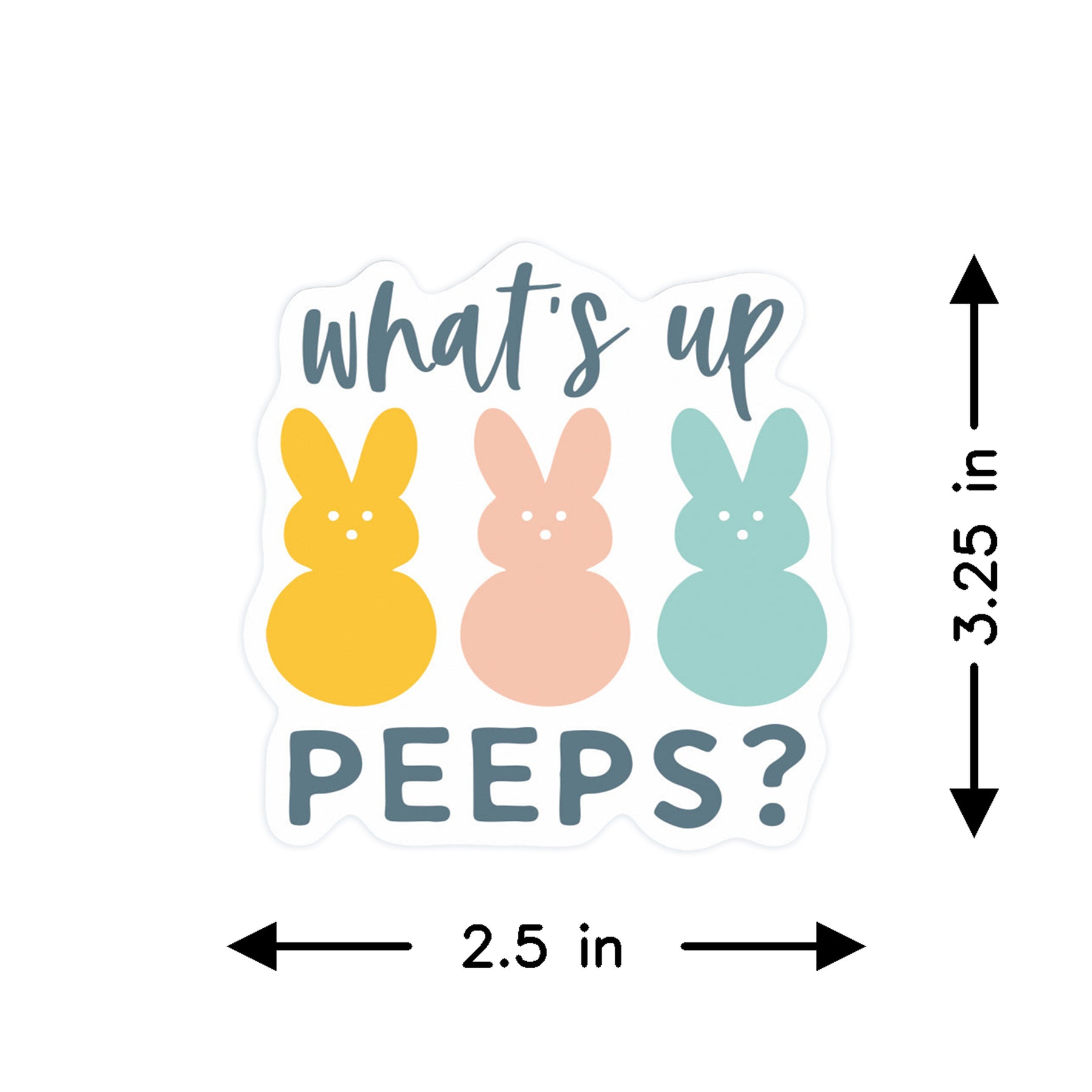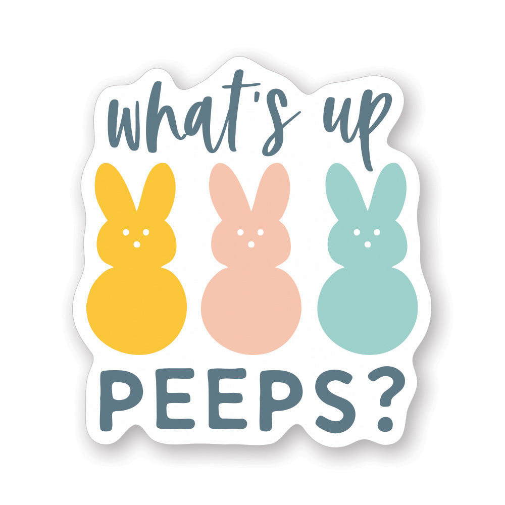 A playful burst of spring energy comes to life in this cheerful sticker design, where bright, cheerful yellows and soft pastels create an instantly uplifting composition. The artwork features charming, hand-drawn-style illustrations of adorable chicks and spring florals, rendered in a whimsical, contemporary style that captures the joy and renewal of the season. The color palette—from sunny golden tones to soft greens and blush pinks—evokes warmth, hope, and the lighthearted spirit of Easter celebrations. Bold, friendly typography sits prominently, perfectly complementing the playful, approachable illustration style. The overall design radiates cheerfulness and nostalgia, inviting smiles and bringing a touch of springtime whimsy to any space. A playful message that shares "What's Up Peeps?"