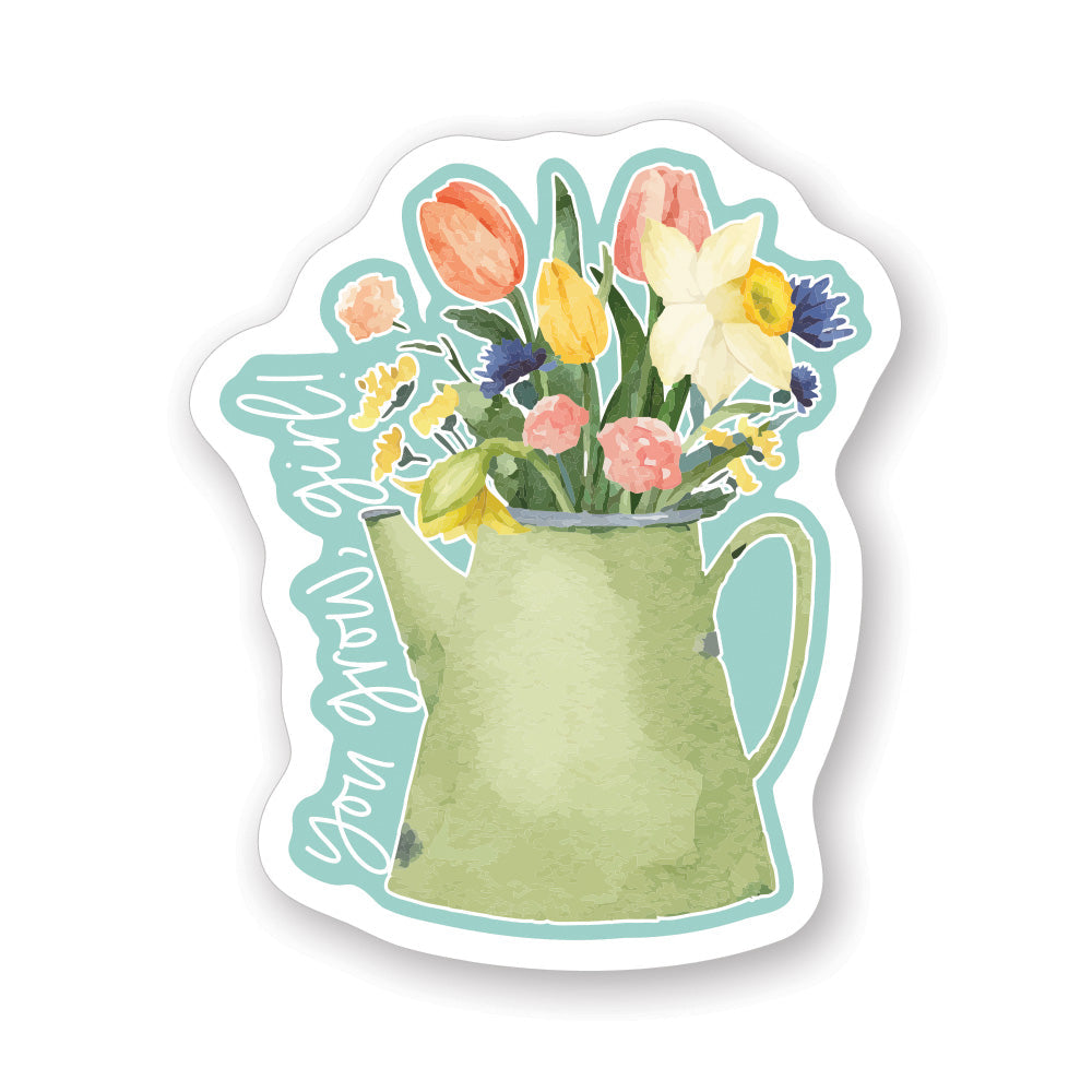A cheerful watercolor illustration celebrates the power of growth and self-empowerment with soft, encouraging brushwork and a warm, uplifting color palette. The design features flowing botanical elements and organic shapes that evoke spring renewal and personal flourishing, rendered in gentle hues that inspire confidence and positivity. The typography is hand-lettered in a friendly, modern script that complements the natural, artistic aesthetic. A playful message that shares "You Grow, Girl!"