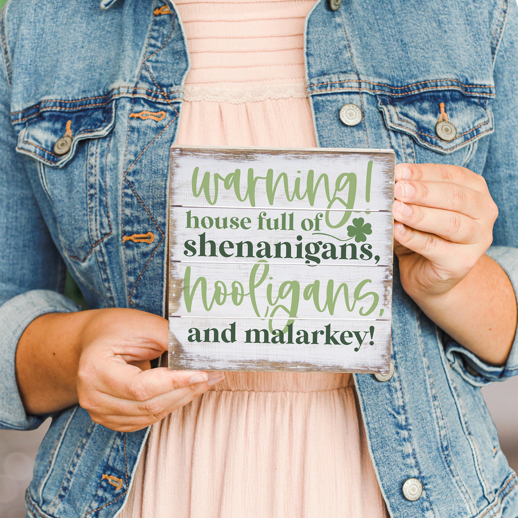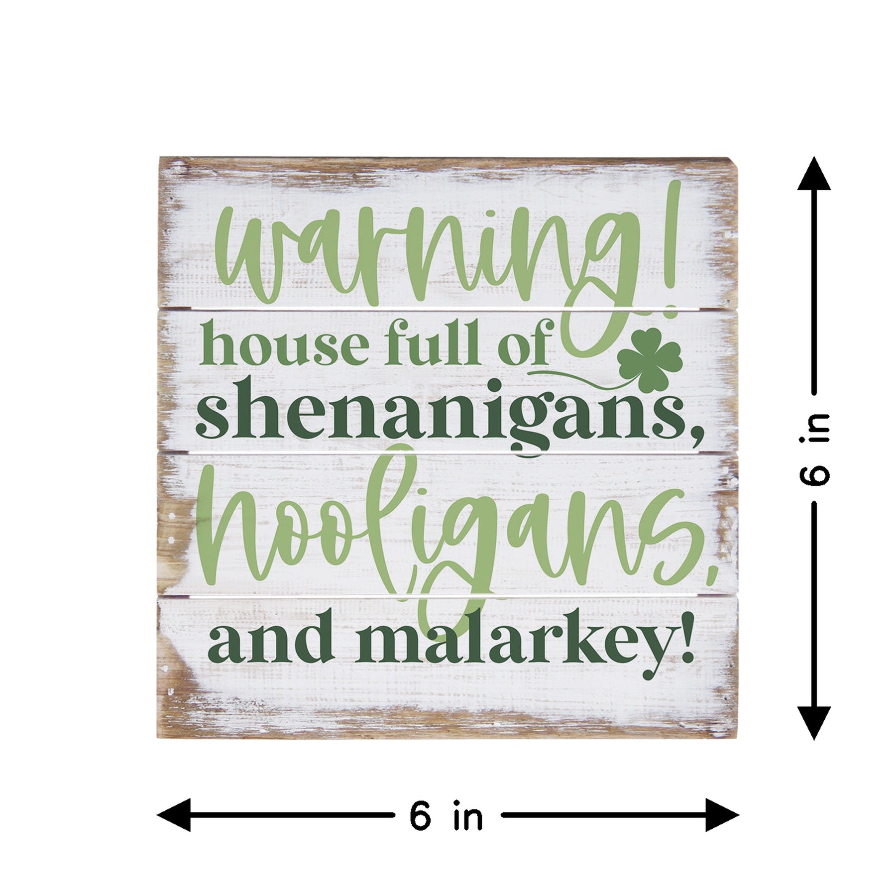 This charming cedar wood slotted board bursts with playful Irish humor and mischievous energy. Bold, hand-lettered typography in a rustic farmhouse style commands attention against the warm natural wood backdrop, while the cheeky message celebrates the joy of a lively, spirited household. The design captures that unmistakable Irish wit—clever, irreverent, and delivered with a wink—making it an instant conversation starter. The deep lip at the top allows for easy hanging, while the compact 6-inch square size fits perfectly on shelves, mantels, or tabletops, bringing lighthearted charm to any room. A playful message that captures the spirit of a home full of fun — "Warning! House Full Of Shenanigans, Hooligans, And Malarkey!".